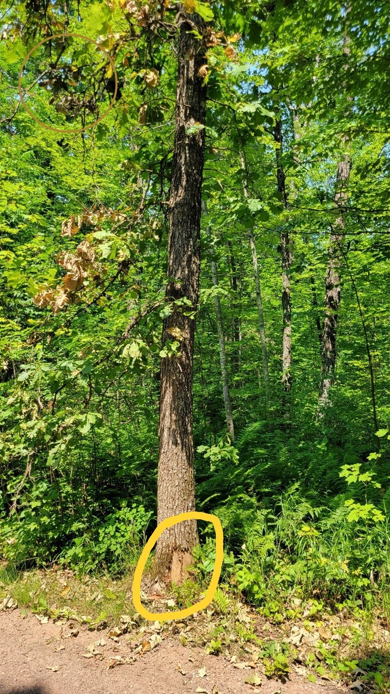This bur oak died over the course of one summer from oak wilt that started from the wound at the trunk base (circled), made in late May or early June 2024.