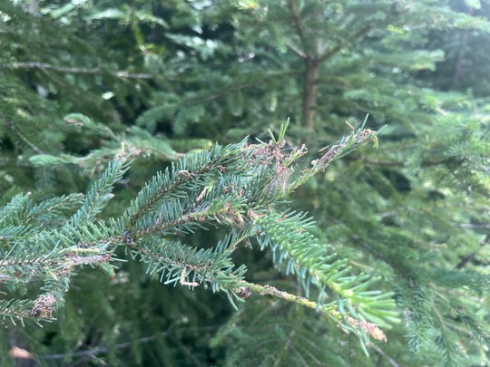 Spruce budworm defoliation results in vast mortality of balsam fir and slightly less for white spruce. A native moth/caterpillar, it goes through predictable outbreaks when there is an abundance of older balsam fir present.