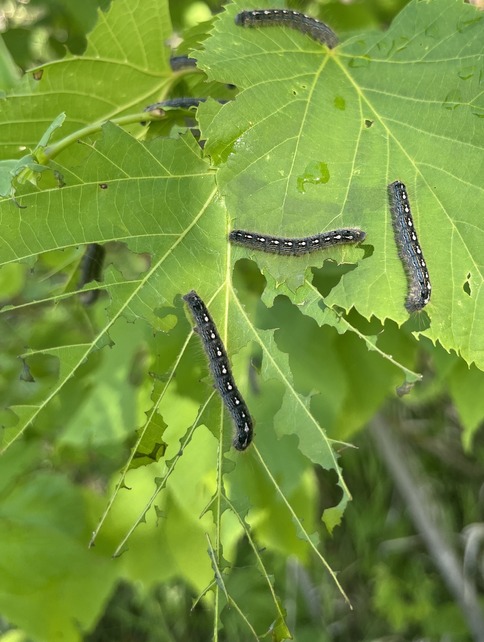 Nearly full-grown forest tent caterpillars munching on basswood in late May 2024.