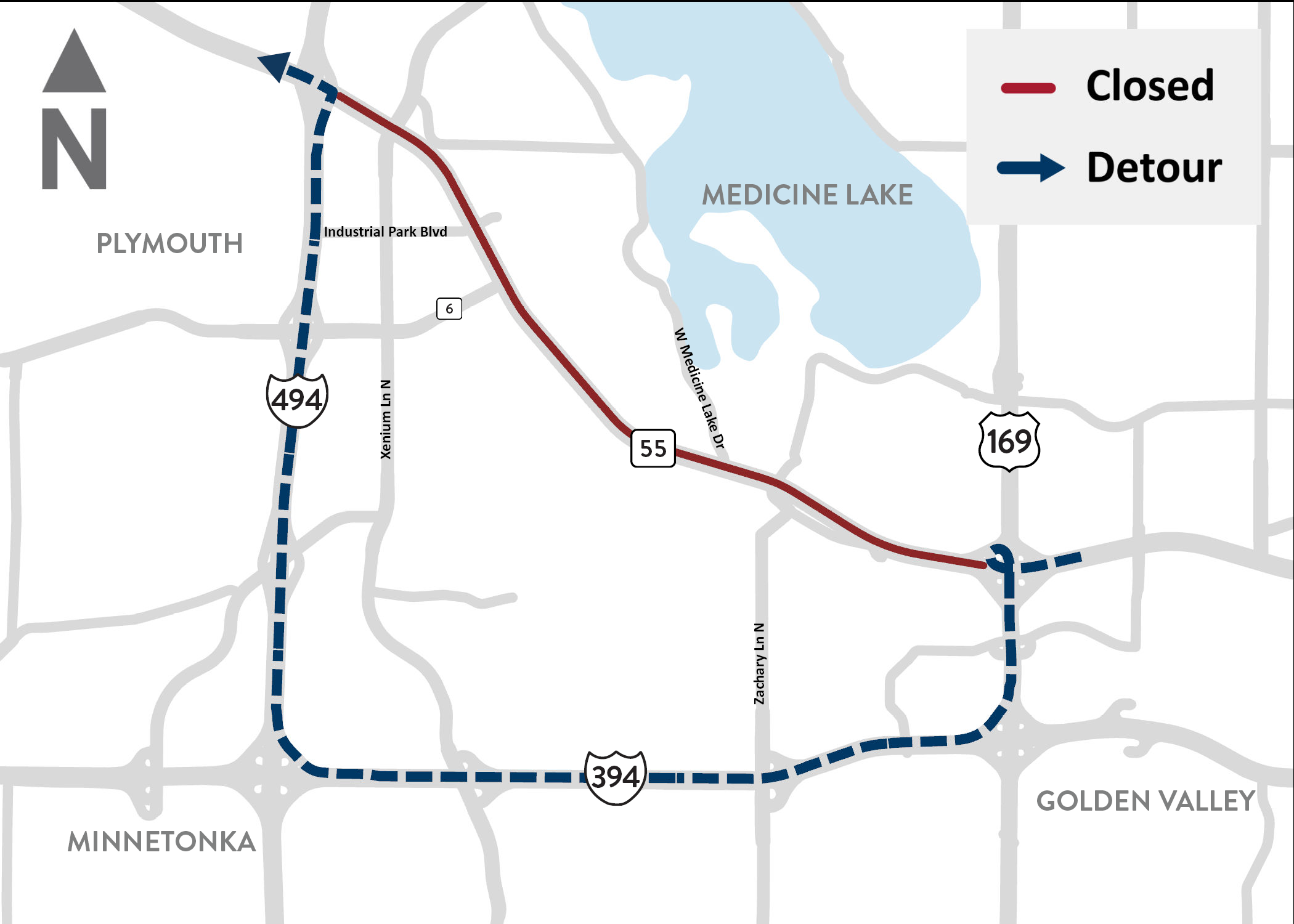 If you plan on traveling in the area, you can use southbound Hwy 169 to westbound I-394 to northbound I-494 as a detour.