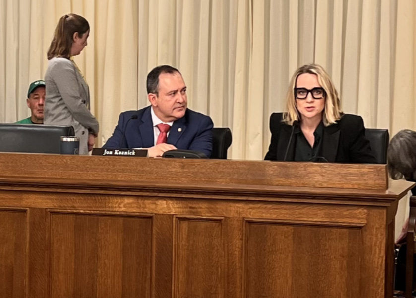 Photo from Transportation Committee while it considered the Transportation Finance Bill. Chair Koznick at the testifiers table with Laura Ziegler from Associated General Contractors of Minnesota.