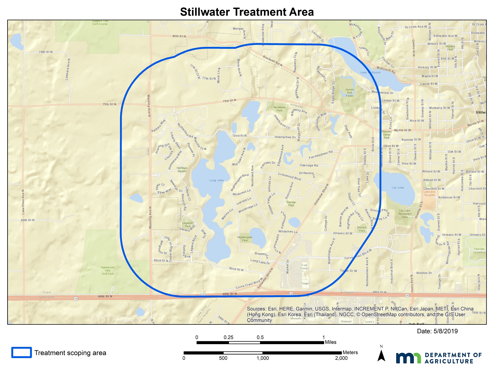 St. Paul, MN: The Minnesota Department of Agriculture (MDA) is planning to treat two areas in the Twin Cities metro area, one in the Lakeville area and another in Stillwater, to eradicate gypsy moth infestations detected in those areas last fall. Officials plan to conduct the aerial treatments on Thursday, May 23, starting as early as 5:15 a.m. The Stillwater area will be treated first. This is dependent on weather conditions at the time.