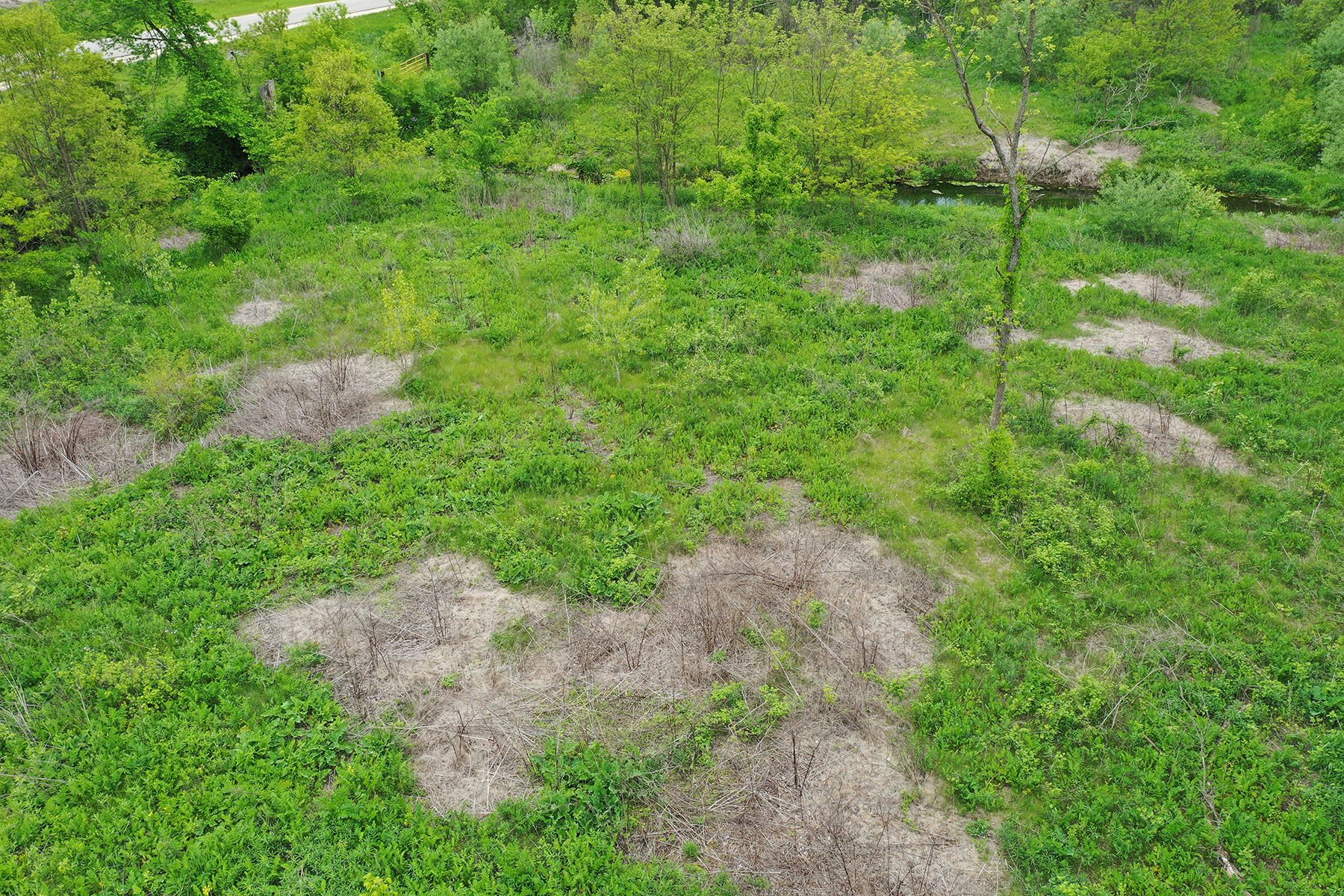 Areas where knotweeds were treated with an herbicide the previous fall are without vegetation for several months. After grasses and other vegetation grow in the area, it’s harder to find the remaining knotweed stems.