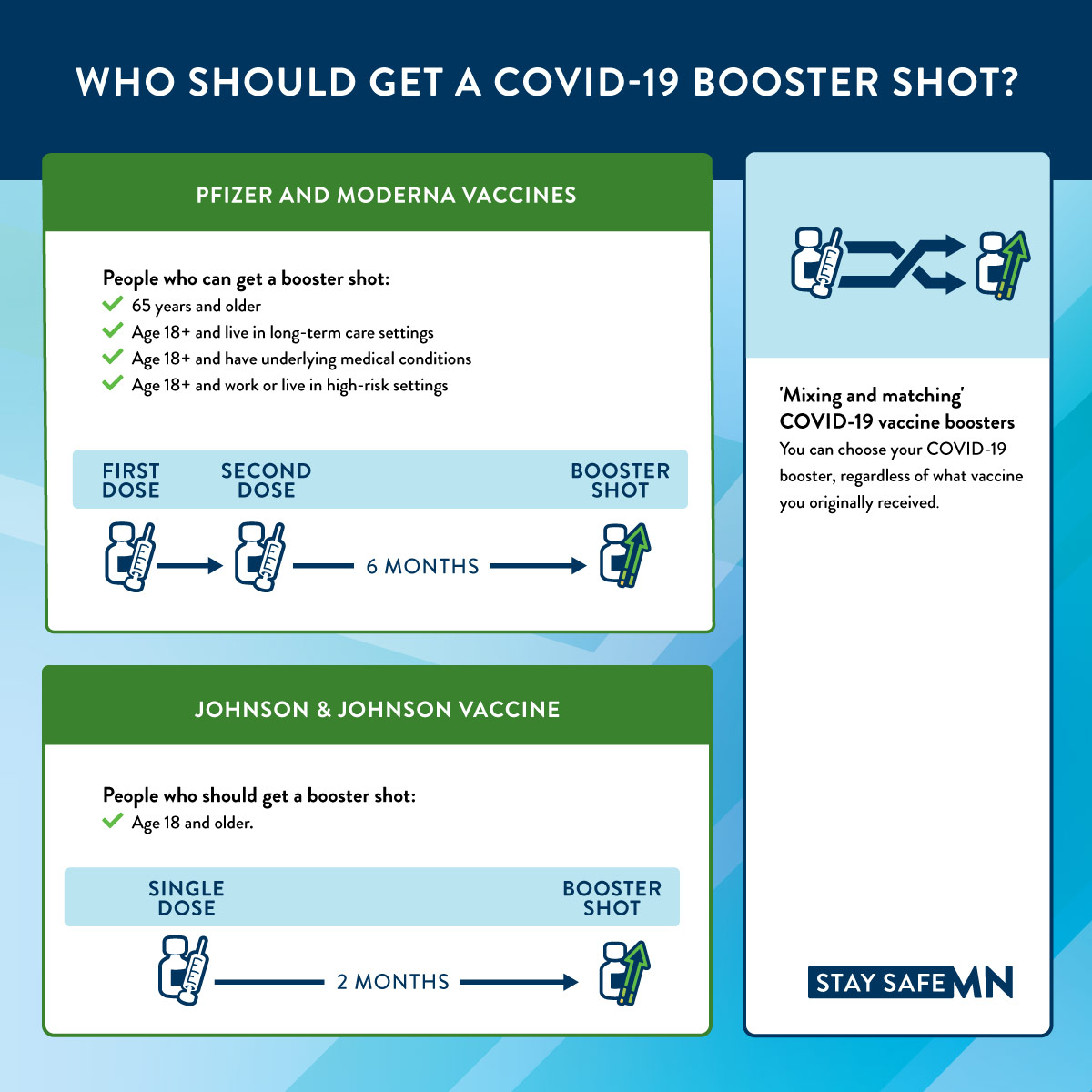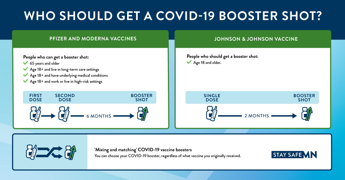 - Minnesota will begin administering Moderna and Johnson & Johnson COVID-19 booster shots to eligible Minnesotans in line with federal guidance issued from the Centers for Disease Control and Prevention (CDC)