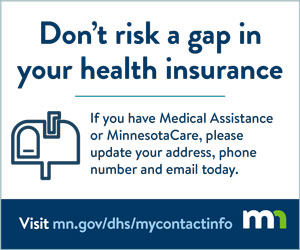 People enrolled in Medicaid (called Medical Assistance in Minnesota) or MinnesotaCare will soon need to renew their coverage in order to keep it. It’s important that you can be reached when it’s time to renew your health insurance. Don’t risk losing your health insurance and possible disruptions in seeing your doctor or filling a prescription. Make sure your contact information is up to date. Get more information from the Minnesota Department of Human Services and update your contact information at mn.gov/dhs/mycontactinfo.