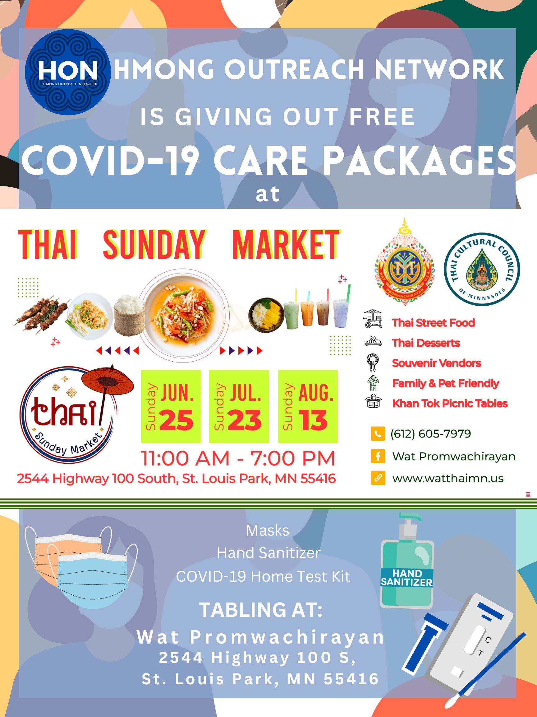 Hmong Outreach Network is giving out free COVID-19 care packages at the Thai Sunday Market, including masks, hand sanitizer, and home test kits.