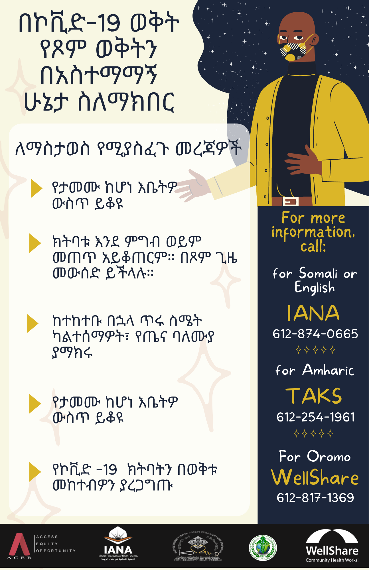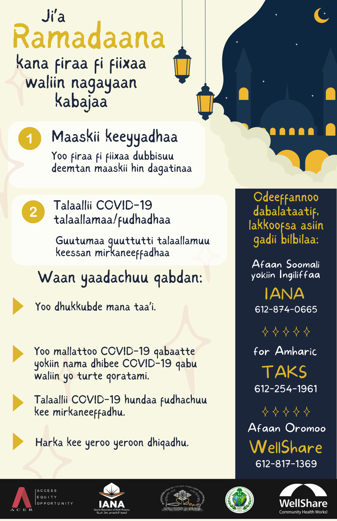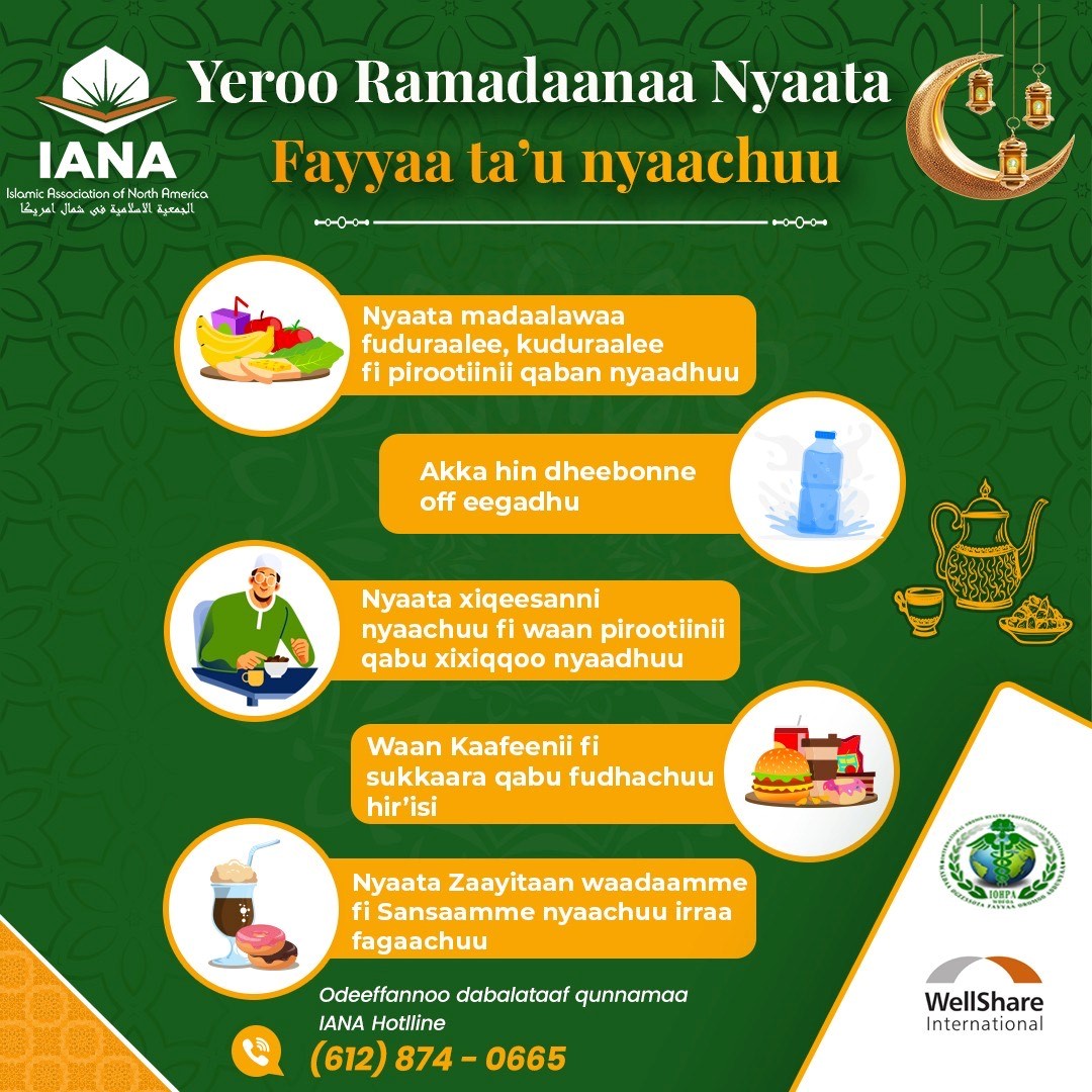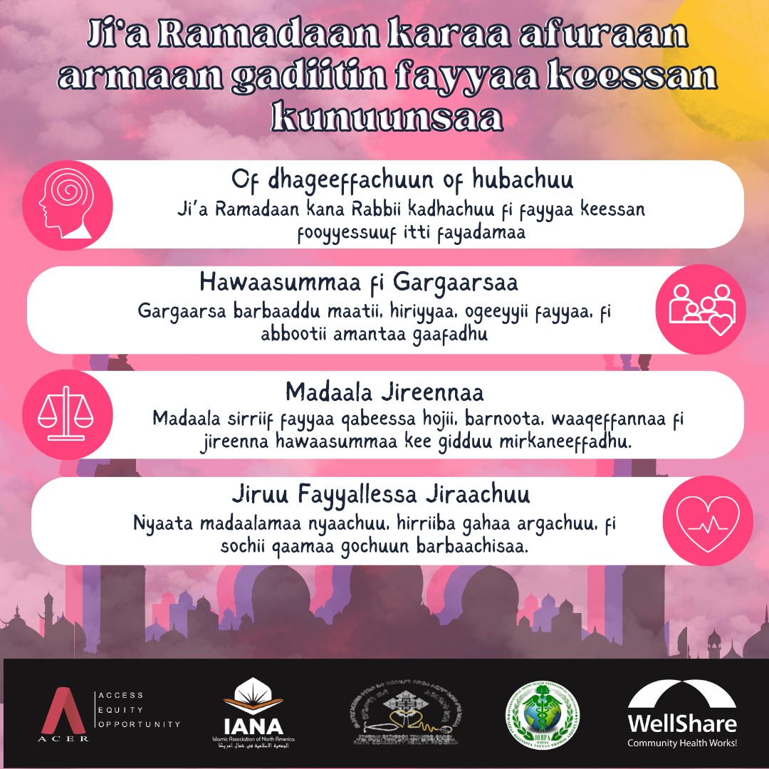 As Ramadan is being celebrated, African Career, Education & Resources, Incorporated (ACER), Islamic Association of North America (IANA), International Oromo Health Professionals Association (IOHPA), Re’ese Adbarat Tserha Aryam Kidist Selassie Cathedral EOTC (TAKS), and WellShare International have developed materials on healthy eating habits, wellness, traveling, and how to gather safely during Ramadan.