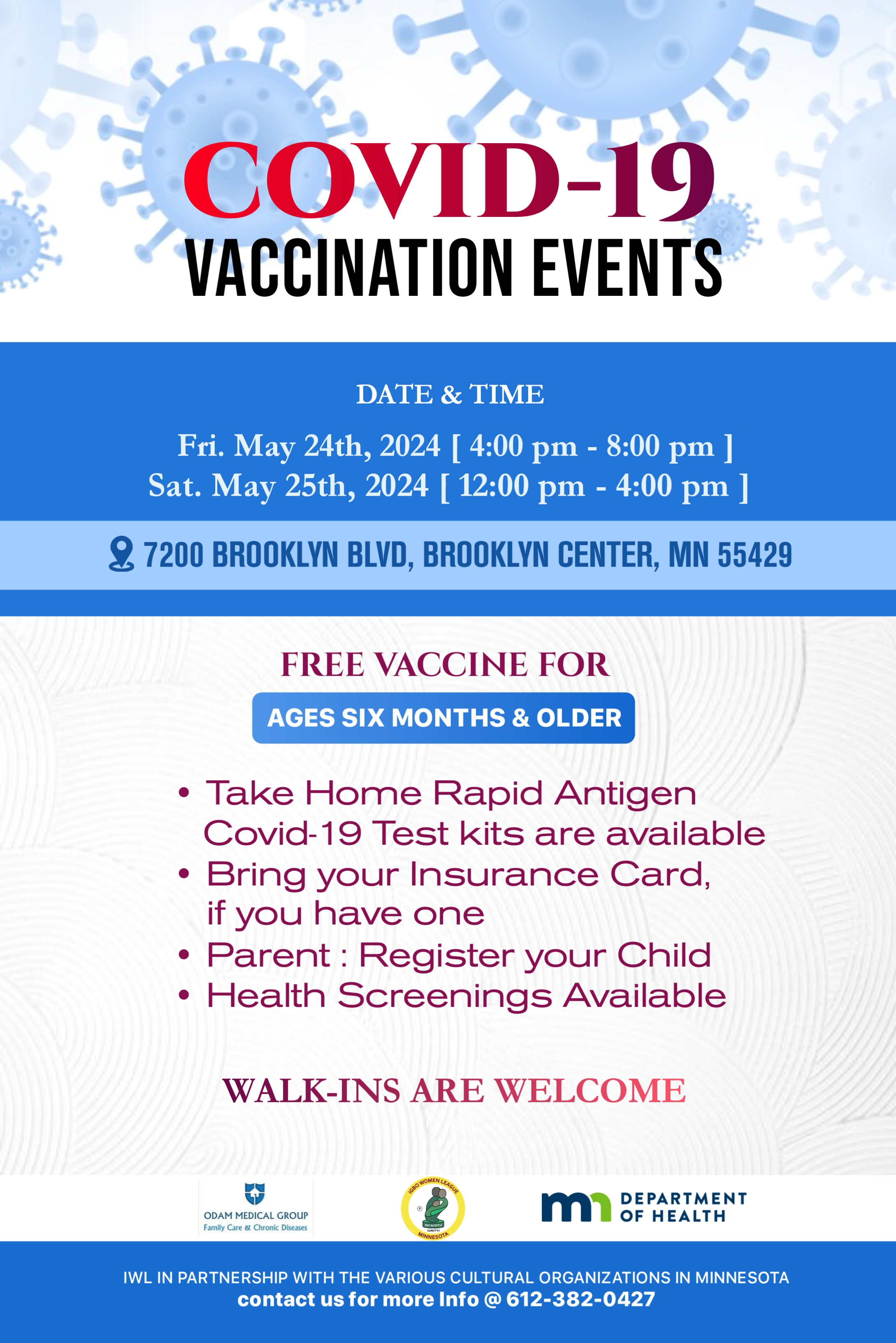 - To locate a community vaccination event near you, call the MDH COVID-19 public hotline at 1-833-431-2053 Monday, Wednesday, Friday: 9 a.m. to 5 p.m., and Tuesday, Thursday: 9 a.m. to 7 p.m.