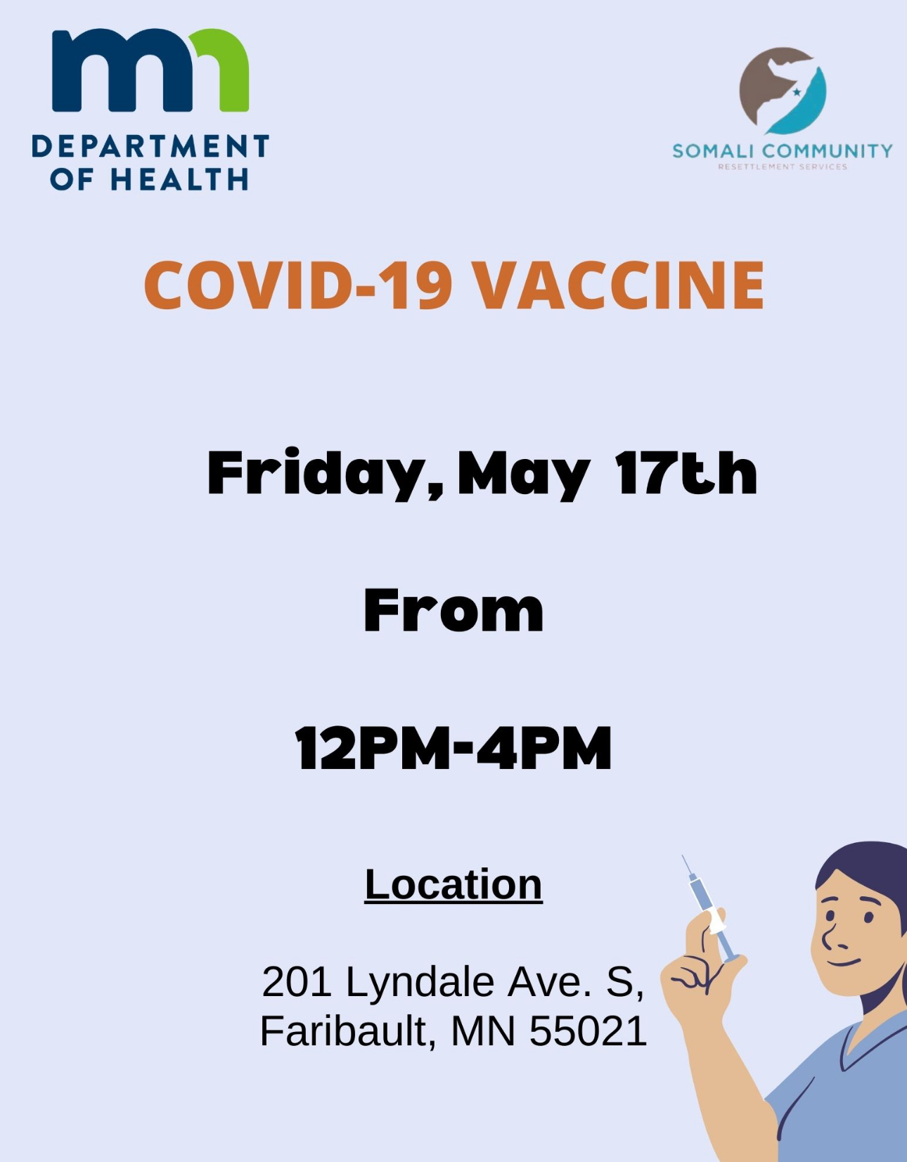 The Minnesota Department of Health (MDH) works in partnership with communities to provide safe and free on-site COVID-19 vaccines.