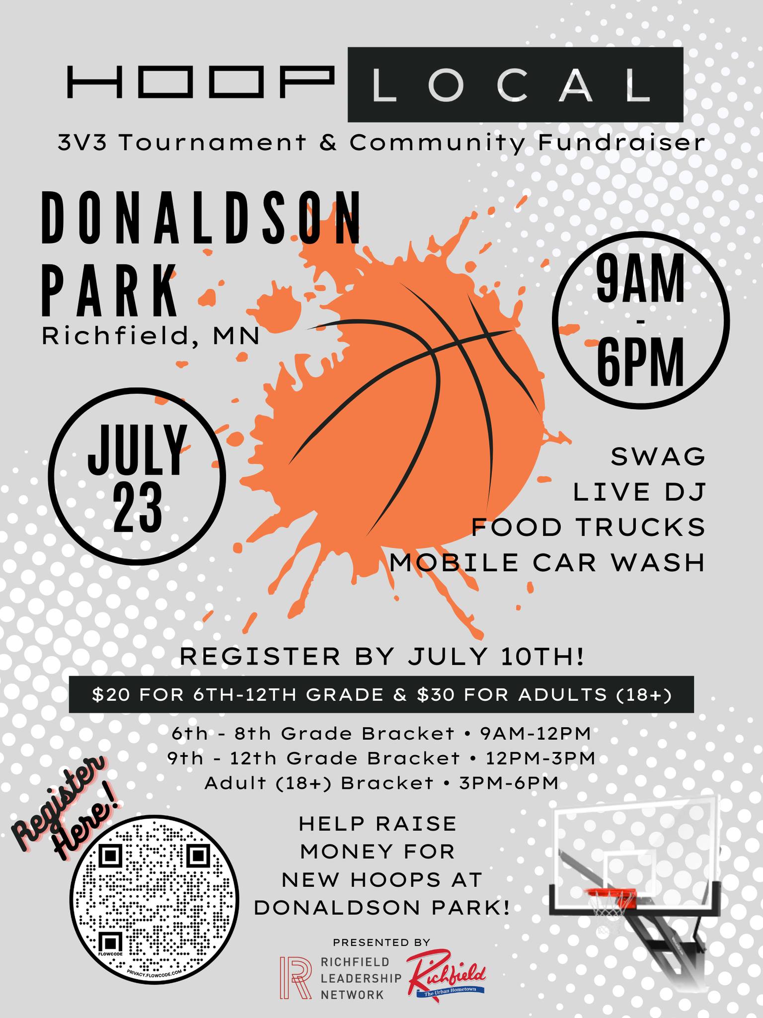 On July 23, a 3-on-3 outdoor basketball tournament and fundraiser will be hosted by the Richfield Leadership Network and the Recreation Services department. The event will help raise money for new basketball hoops and backboards at Donaldson Park.