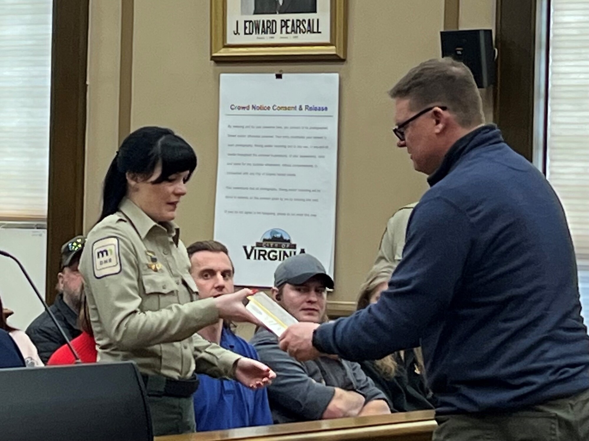 DNR pilot Grace Zeller receives a 911 Lifesaver Award from Jason Matthias for making two flights into the BWCA two rescue two men who'd been injured in last year's Curtain Falls incident that left two other men dead.