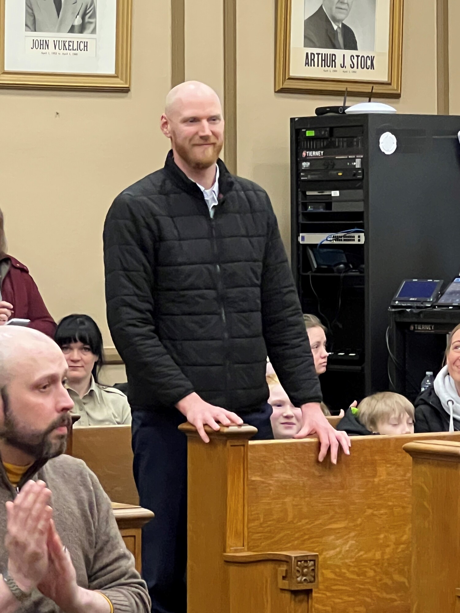 Deputy Scott Garrick smiles as his colleagues return to their seats after being honored for saving his life.