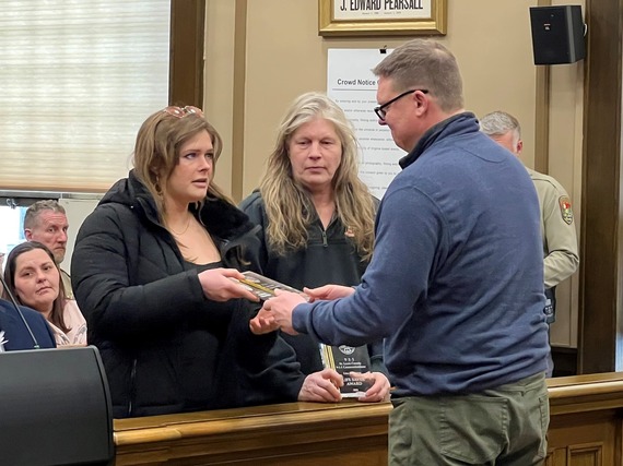 Amber and Lisa Reinking are presented 911 Lifesaver Awards for their quick actions to save two neighbors whose house had exploded.