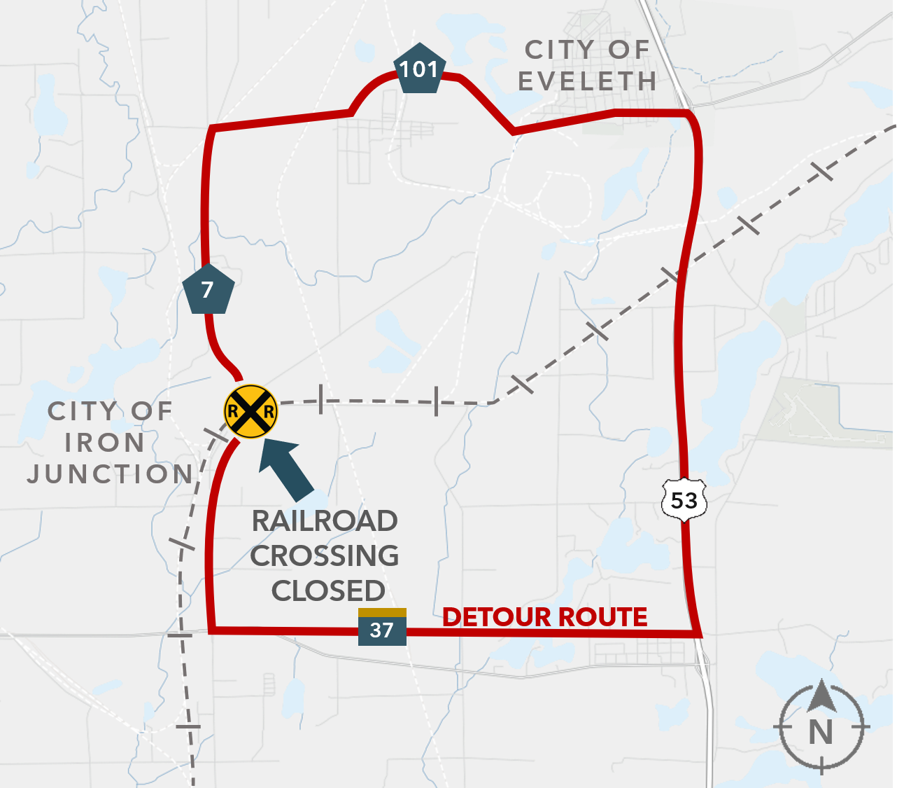 The CN Railroad will be completing work on a railroad crossing on Highway 7 near the city of Iron Junction, southwest of Eveleth beginning on Monday, September 15. Highway 7 will be closed to thru traffic for the duration of the week. The crossing is located between Old Mesabe Road and Ramshaw Road North.
