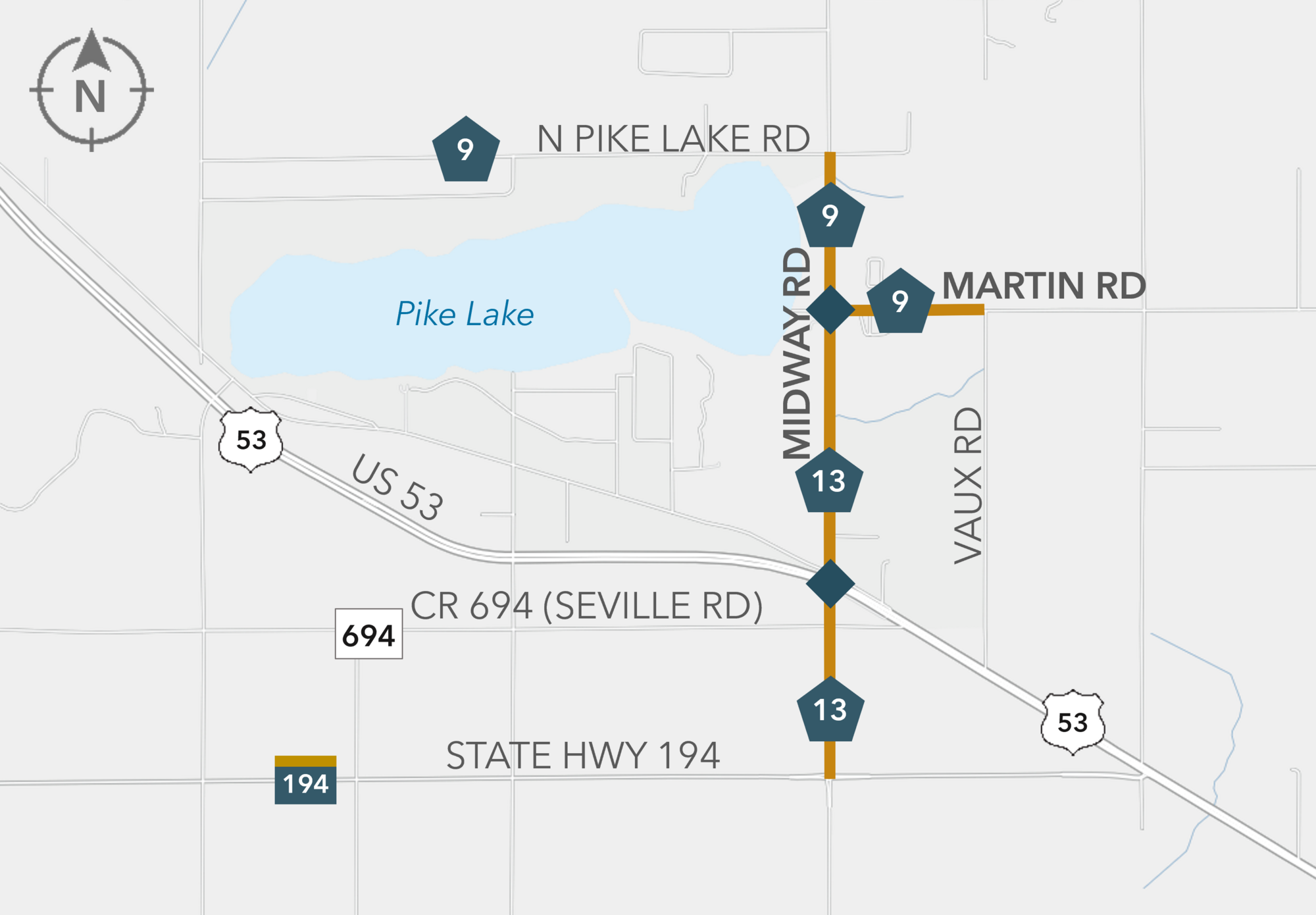 St. Louis County Public Works is studying the two-mile segment of Midway Road between Highway 194 in Hermantown and North Pike Lake Road in Canosia Township, along with a short segment of Martin Road that connects to it. This corridor has a variety of safety concerns including a high density of access points and additional intersections with frontage roads, an aging traffic signal, lack of accommodations for pedestrians and bicyclists along a road that is heavily traveled by large vehicles, and other issues.