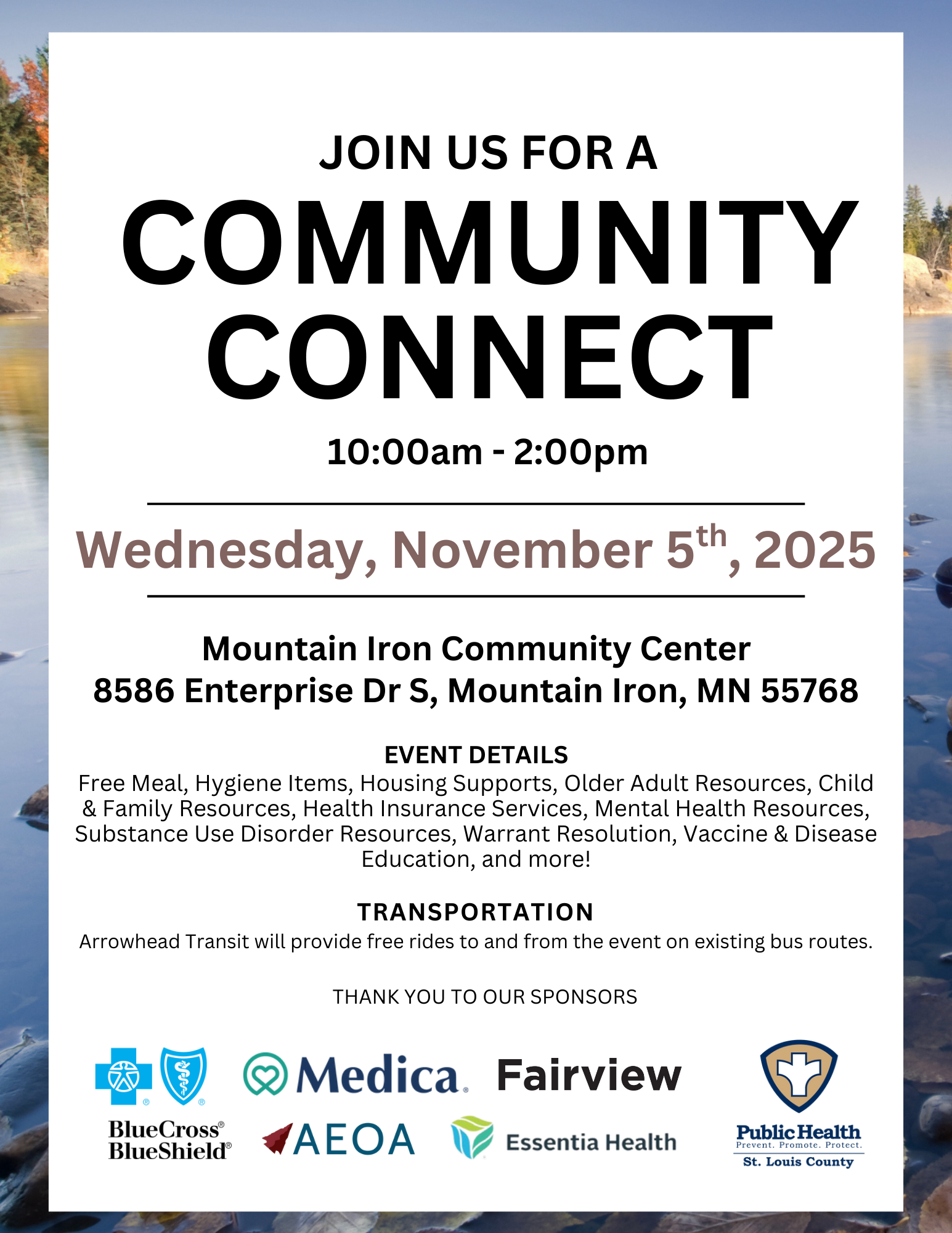 This Community Connect is co-sponsored by St. Louis County Public Health, Fairview, Essentia Health, AEOA, Medica, and Blue Cross Blue Shield.