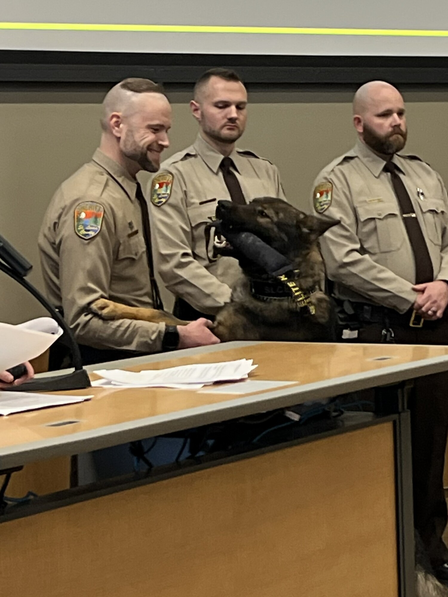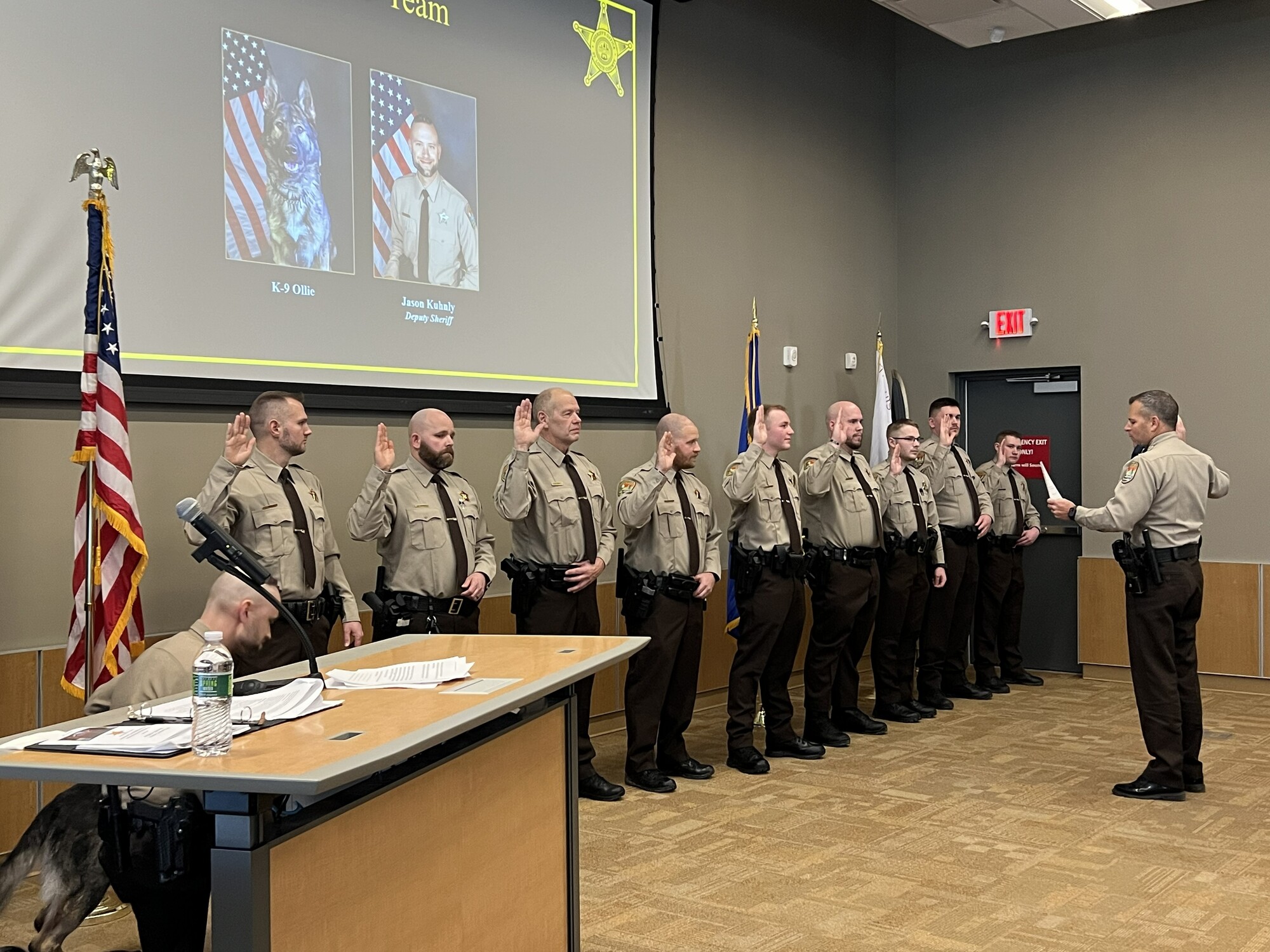Nine new deputies and nine correctional officers have joined the St. Louis County Sheriff's Office. During a ceremonial pinning of badges held Wednesday at the Public Safety Building, Sheriff Gordon Ramsay welcomed the largest group of new deputies sworn in at one time to the department in 20 years. They include: Peter Christiansen, Jordan Porter, Austin Wick, Kyle Cotrell, Dylan Helman, Michael Nordean, Bradley Wick, Matthew Woitel, and Ethan Wolfe. The new deputies all joined the Sheriff's Office in 2025. Also sworn in was K-9 Ollie, who graduated from training in November and is certified in narcotics detection and various patrol functions.