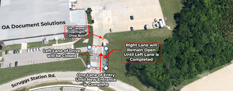 As the new entrance is being built, drivers will use the right lane until work on the left lane is completed. The OA Carpool overnight drop box will remain in its current location, just inside the main entrance.