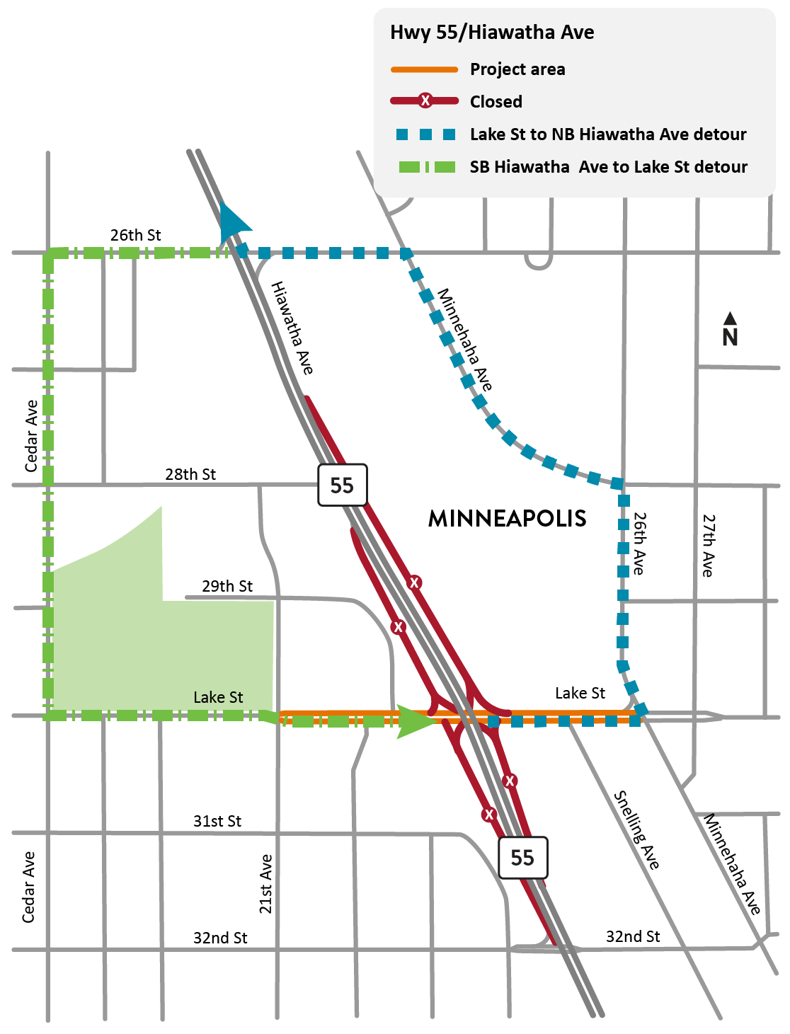 - The ramps to/from Hiawatha Ave. and Lake St. are closed
