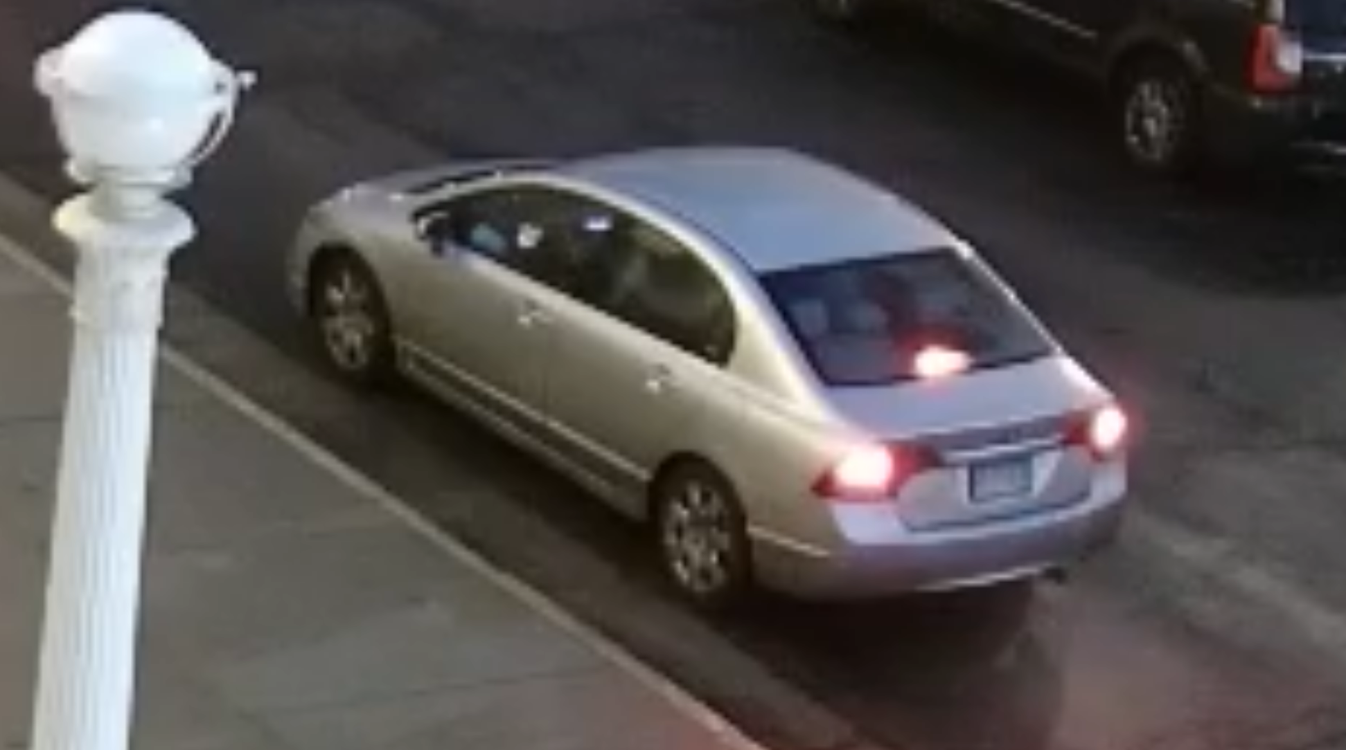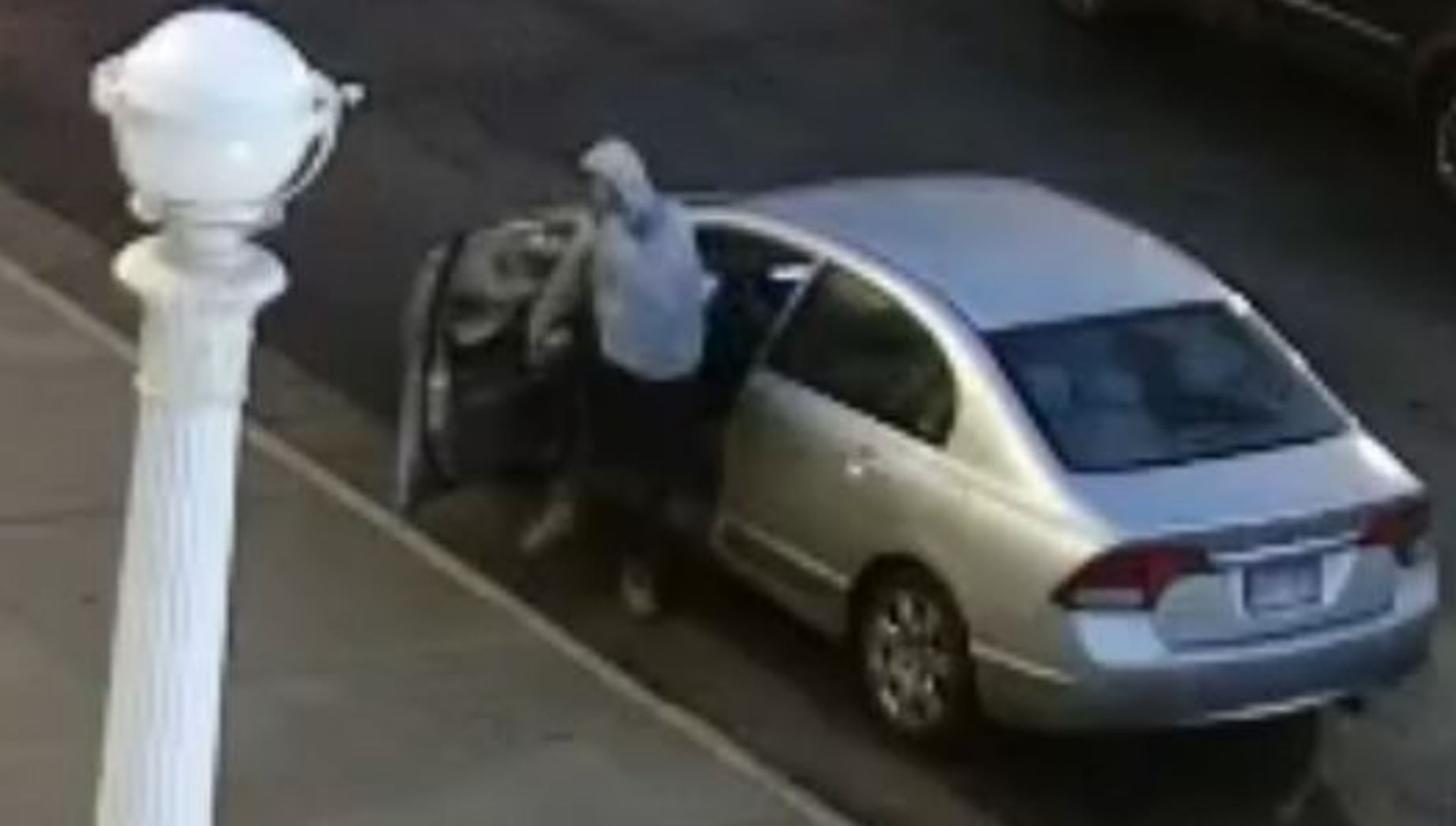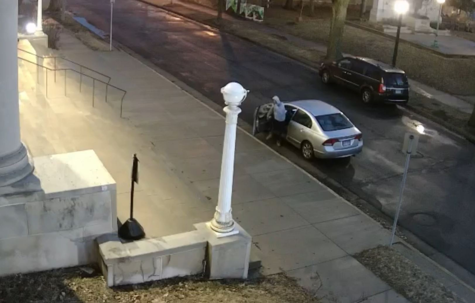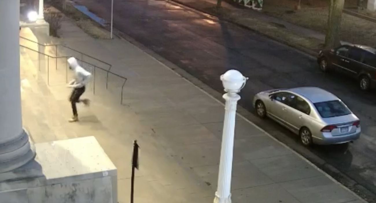 At approximately 7:19 a.m., a suspect is observed on surveillance cameras spray painting swastikas on the doors and a pillar that face Emerson Av. S. The suspect who was wearing a white hoodie with the hood up, a black face covering, black jogger pants, and tan boots arrived and left in a silver Honda Civic and spent less than two minutes at the temple.