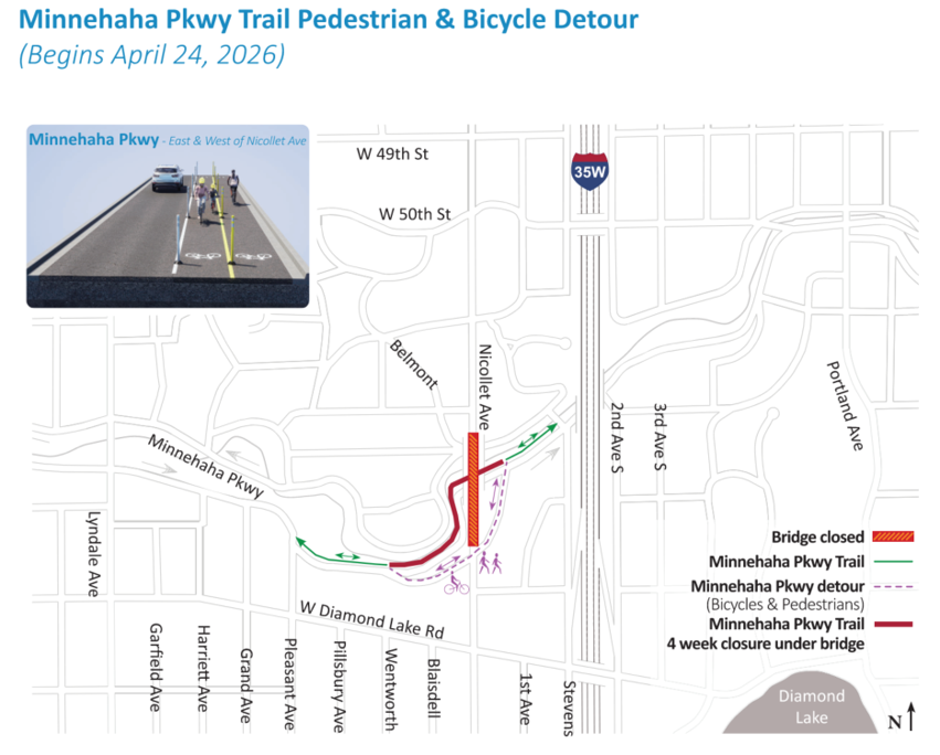 Minnehaha Parkway was closed effective February 23, 2026. Minnehaha parkway bike and pedestrian trails will close for four weeks beginning on April 24, 2026.