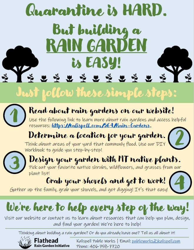 Emilie has also been providing support for Flathead Rain Garden Initiative (collaborative public program between Flathead Conservation District, Flathead Basin Commission and the City of Kalispell). She has been working with the conservation district's BSWC member to create and add a number of materials to the Flathead Rain Garden Initiative website, including three theoretical rain garden designs, a Montana Native Plants List, a DIY workbook and a Homeowner Incentive Agreement that outlines the conditions of the program.