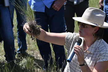 On June 18 Wickens Salt Creek Ranch hosted the 2025 Montana Range Tour outside of Winifred, Montana. Around 100 people converged to learn about regenerative grazing, soil health, and tour the Wickens' beef cattle operation. Eric & Emma Wickens are the 2024 Leopold Conservation Award winners, and the tour featured guest speaker Byron Shelton, the Senior Program Director for Savory Institute. Byron was joined by Kendall Morgan of the Winnett ACES.