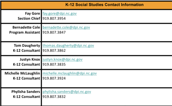 If you would like to share any upcoming events, professional learning opportunities, instructional resources, or award/grant opportunities with the NCDPI Social Studies Listserv, please send a brief explanation or description, image, and any pertinent additional information by the 4th of each month to