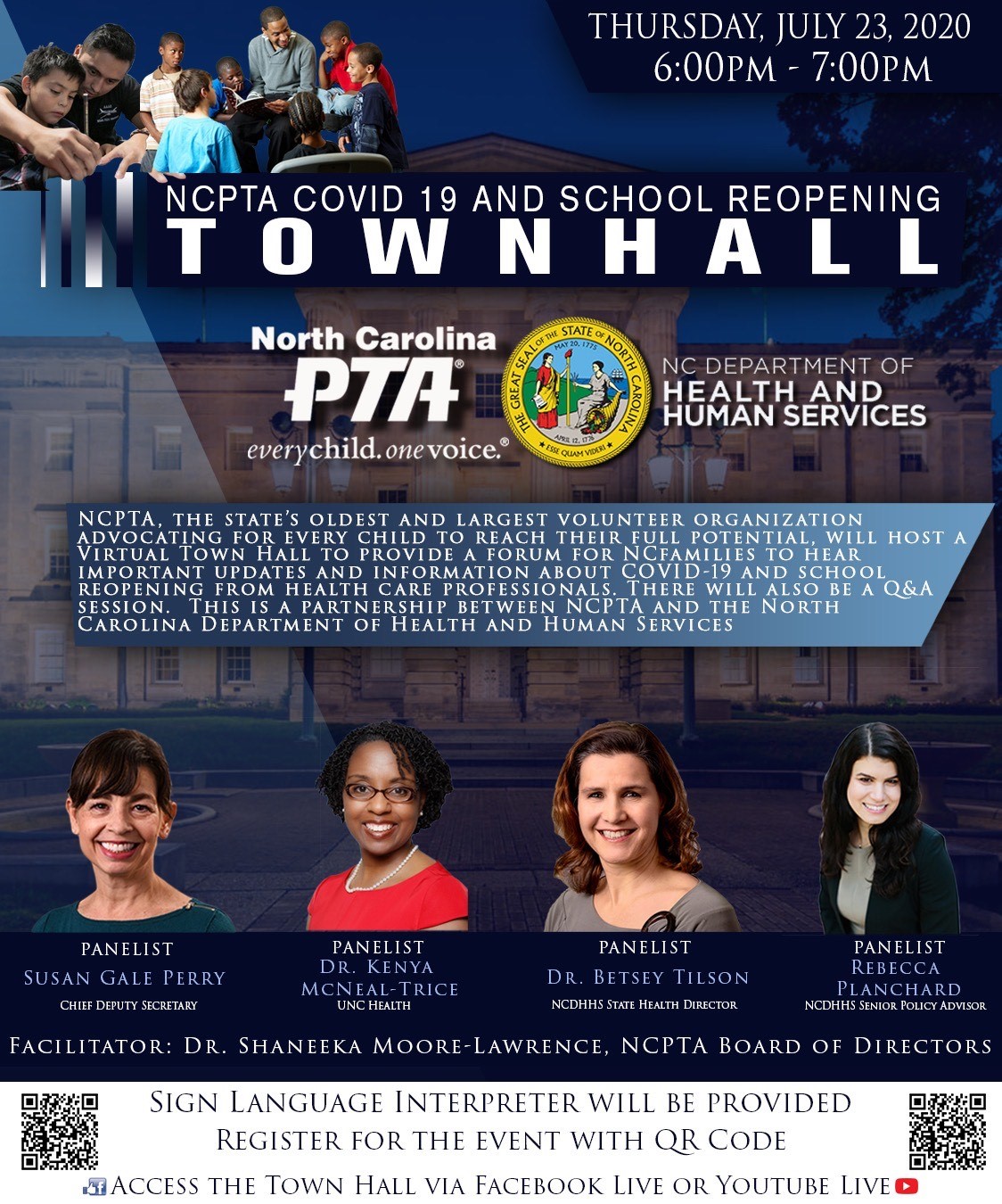 Please find the attached press release and flyers for two NCPTA COVID-19 and School Reopening Virtual Town Halls scheduled for Wednesday, July 22 and Thursday, July 23. Both Town Halls will be held from 6:00 p.m.-7:00 p.m. The press release and the flyers include registration information for parents and teachers.