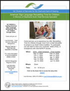 The North Carolina Division of Services for the Deaf and Hard of Hearing (NC DSDHH) is hosting American Sign Language (ASL) Storytelling Time for children through Zoom during the 2024-2025 school year.