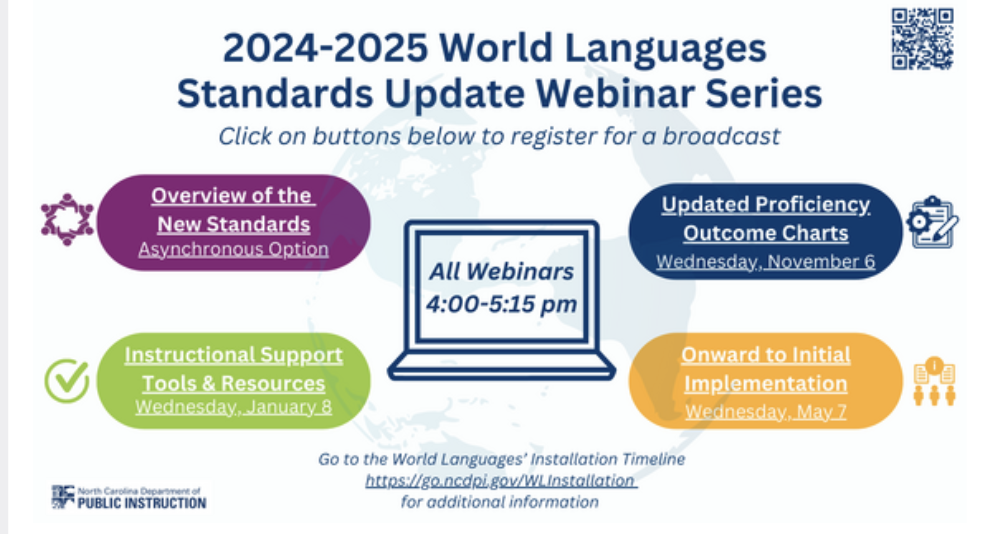 This series continues throughout 2024-2025 as part of the World Languages' Installation Timeline, and there are also broadcasts scheduled about the instructional support tools and resources, as well as the plans for initial implementation in the 2025-2026 school year. Please share the 2024-2025 World Languages Standards Update Webinar Series flyer (pictured below) at go.ncdpi.gov/WLwebinars24-25, which has registration links for upcoming webinars and access to the asynchronous option for past webinars.