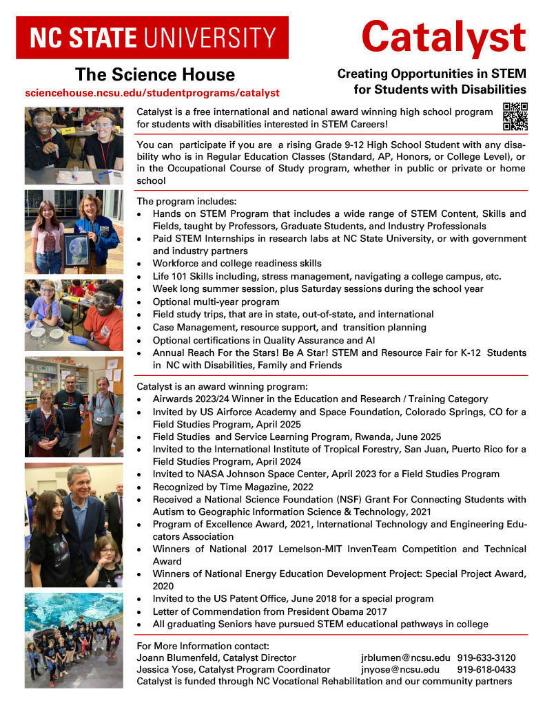 Open House for Catalyst, a free International and National Award winning STEM program, for June 2025-June 2026, for New Students will be on either January 16, 2025 Virtually from 7PM-8PM or January 18, 2025 in person at NC State University from 10AM-11AM.