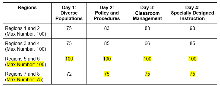 We have received some cancellations and have been filling seats from our “Wait List” for Regions 5 and 6 and will continue to accommodate those requests as a priority. On May 1st, remaining seats will be made available to everyone in the state regardless of the region they are employed.