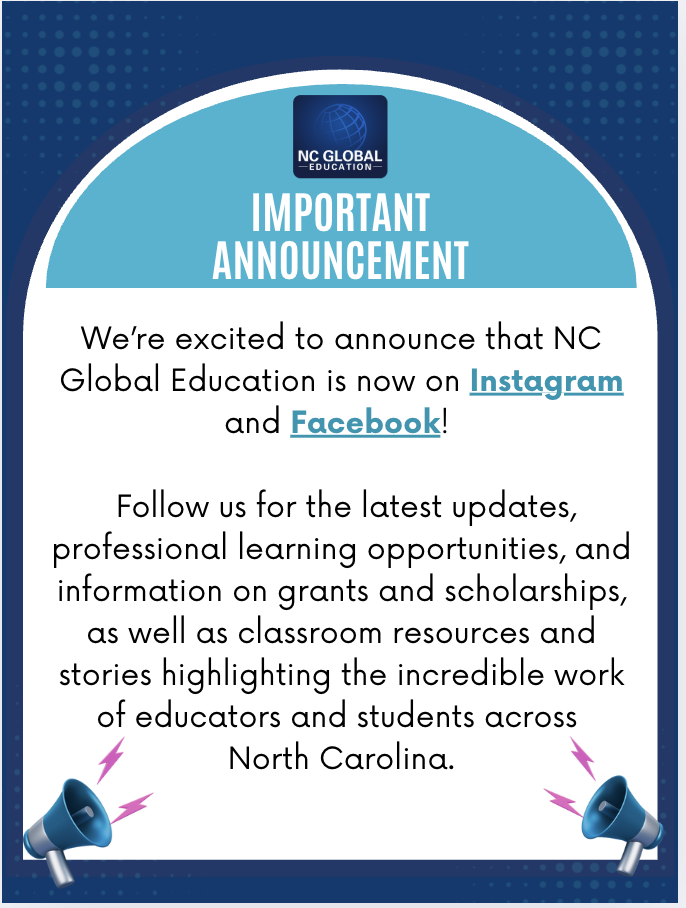 Follow us to stay inspired and informed about global learning opportunities, resources, and stories from classrooms and districts across North Carolina.