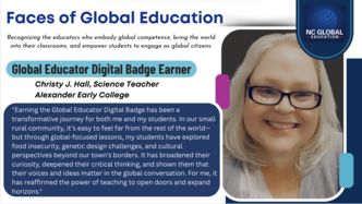 We are proud to recognize Ryan Bailey, a history teacher at Franklin Academy High School, and Christy J. Hall, a science teacher at Alexander Early College, as two of over 140 educators across North Carolina who have earned the Global Educator Digital Badge (GEDB). This recognition honors educators who integrate global perspectives into their classrooms, equipping students with the skills and mindsets needed to thrive in an interconnected world.