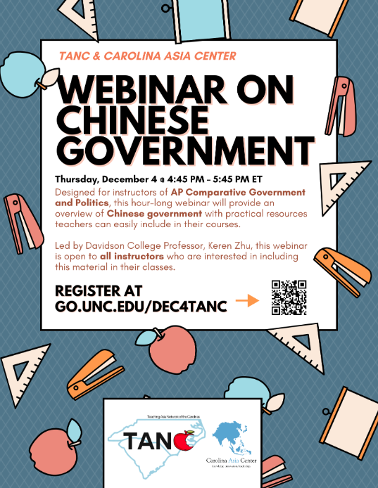 Join the TANC program and the Carolina Asia Center for a one-hour webinar designed specifically for AP Comparative Government and Politics instructors. This session will offer a clear, accessible overview of the Chinese government, along with practical teaching resources you can immediately use in your classroom.