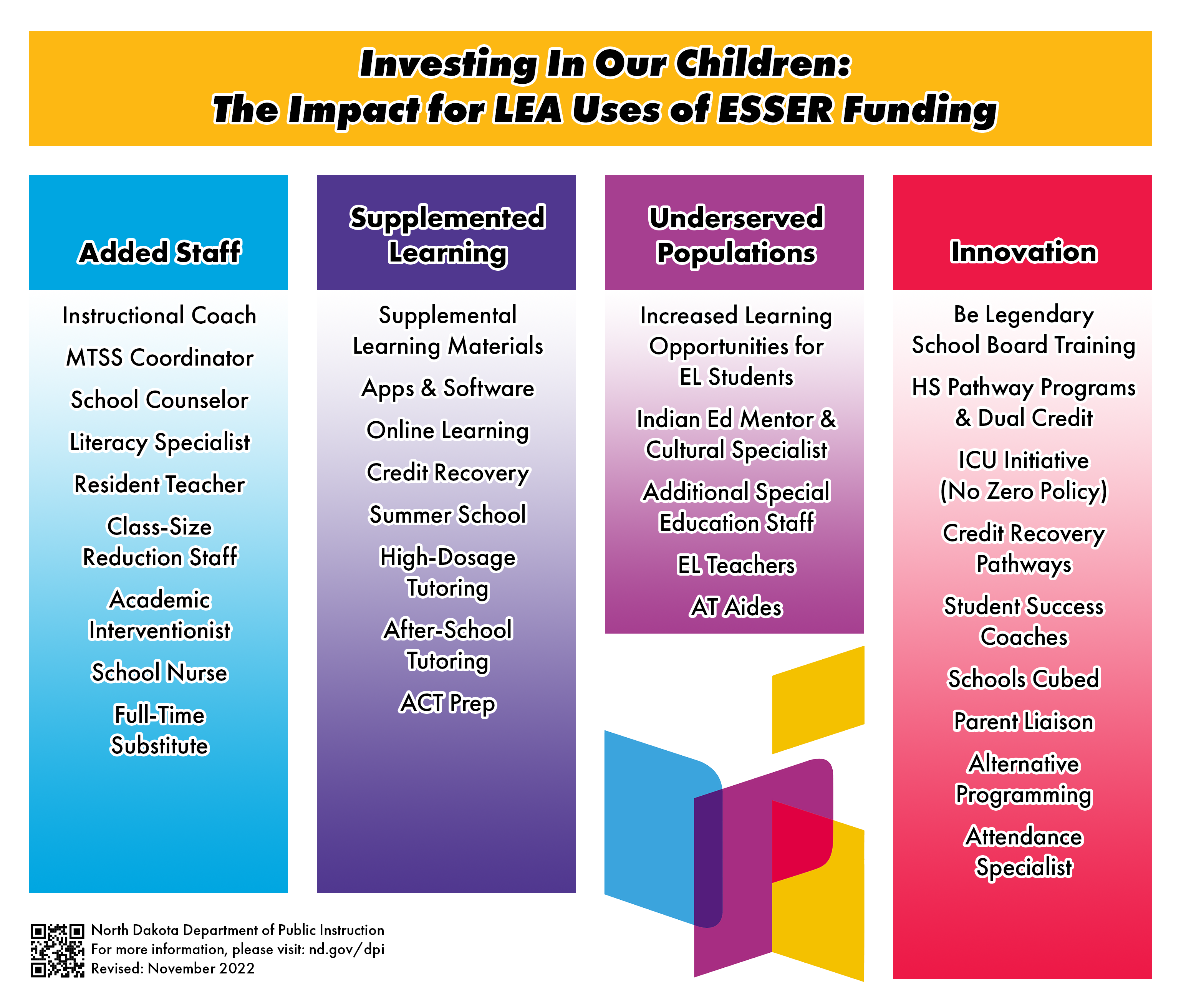 Over the past two years, both the NDDPI and our local school districts have been granted an unprecedented amount of Federal funds to respond to the pandemic. Due to this influx of funding, some programs end up with unused funds. One of the funding streams that currently has excess funds is the 21-22 School Improvement grant.