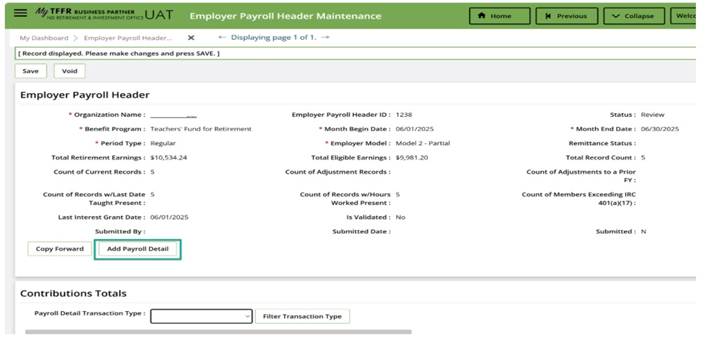 - On Employer Payroll Header, select “Add Payroll Detail” (see Screenshot #1).