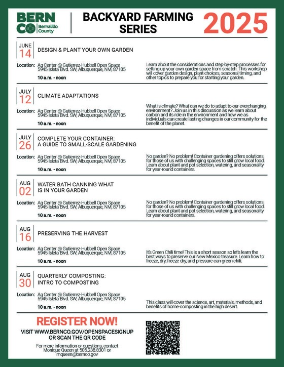 Learn how to container garden, compost, and more by attending a Backyard Farming workshop! Workshops are held at the Ag Center at Gutierrez-Hubbell Open Space.