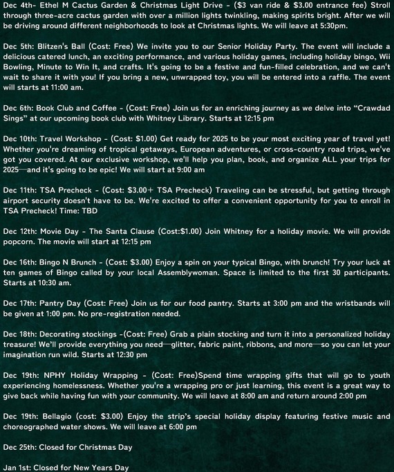Join us this holiday season for fanciful, festive fun with a range of concerts, events, and activities across our parks, recreation centers and Water Street Plaza Amphitheater. We invite everyone—residents and visitors alike—to experience our exceptional holiday festivities. For a full list of events and programming, visit HendersonHappenings.com. Celebrate the season with us!