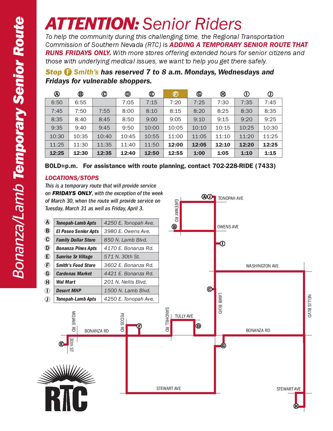 Additionally, below you'll find useful links, phone numbers and information from the city of Las Vegas and other community partners who are offering different services. One I'd like to highlight is the RTC Silver STAR service that's free for our seniors who are 60+ years old. There's a temporary route that will start to run on Tuesday, March 31, but will continue to operate on Fridays (April 3) around the Bonanza/Lamb area. This transportation line will provide a broad range of destinations and can accommodate up to two wheelchairs at a time. For more route details, click on the link below.