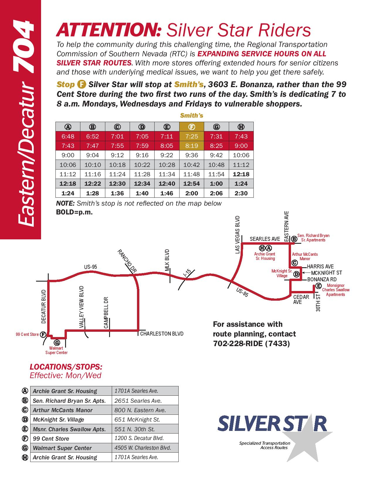 The RTC is expanding services on all 12 of its Silver Star routes with more pick-up locations, extended hours and temporarily adding one more route in the northeast valley. These looped routes provide senior citizens with access to grocery stores, banks and more. Earlier starting times help riders take advantage of stores offering extended hours for senior citizens and those with underlying medical issues. Each Silver Star vehicle can accommodate up to two wheelchairs at a time.