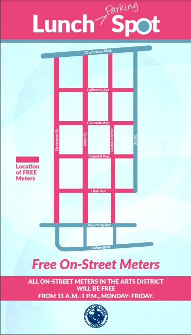 All on-street meters in the Arts District will be free in an area bounded by Charleston Boulevard to the north, Commerce Street to the west, Third Street on the east and Oakey Boulevard to the south. (See map.)