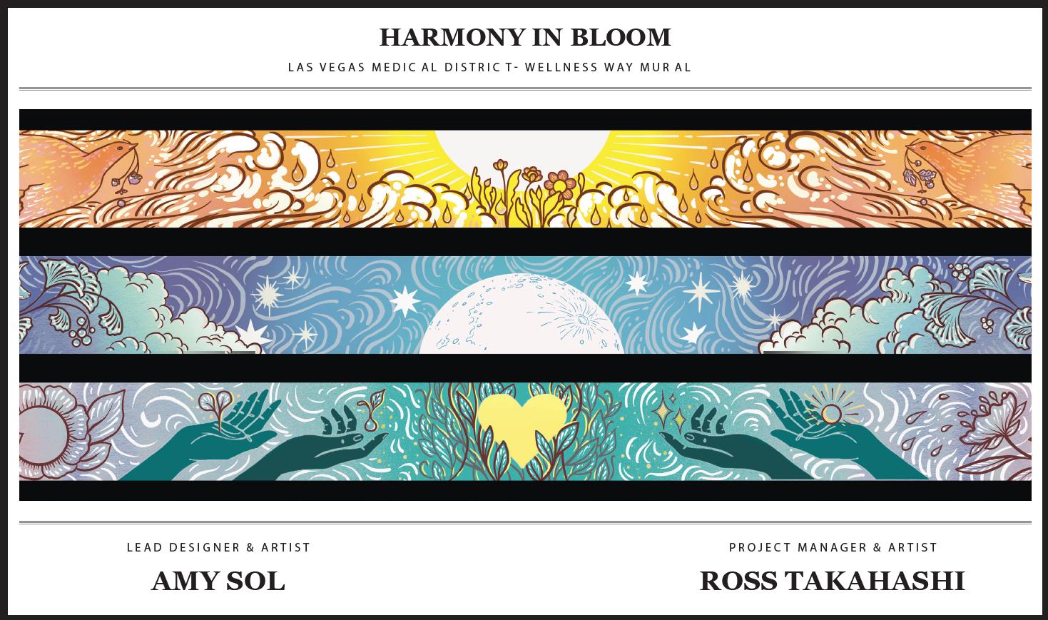 Painting of the mural began Nov. 6, 2023, and was completed Dec. 9, 2023. The mural height ranges from 36 inches to 58 inches on the block-long, L-shaped, step-down wall. The artists were paid $33,750 for the work with money from the city of Las Vegas Ward 1 Capital Improvement Project Fund. UNLV has contracted with the city to allow the mural to be painted on its wall along Wellness Way. Community feedback asking for a space to help people feel calm and safe helped guide the design. The artists were selected by an independent evaluation panel comprised of project stakeholders. (See mural design.) The mural is the first of five public artworks planned for the Las Vegas Medical District.