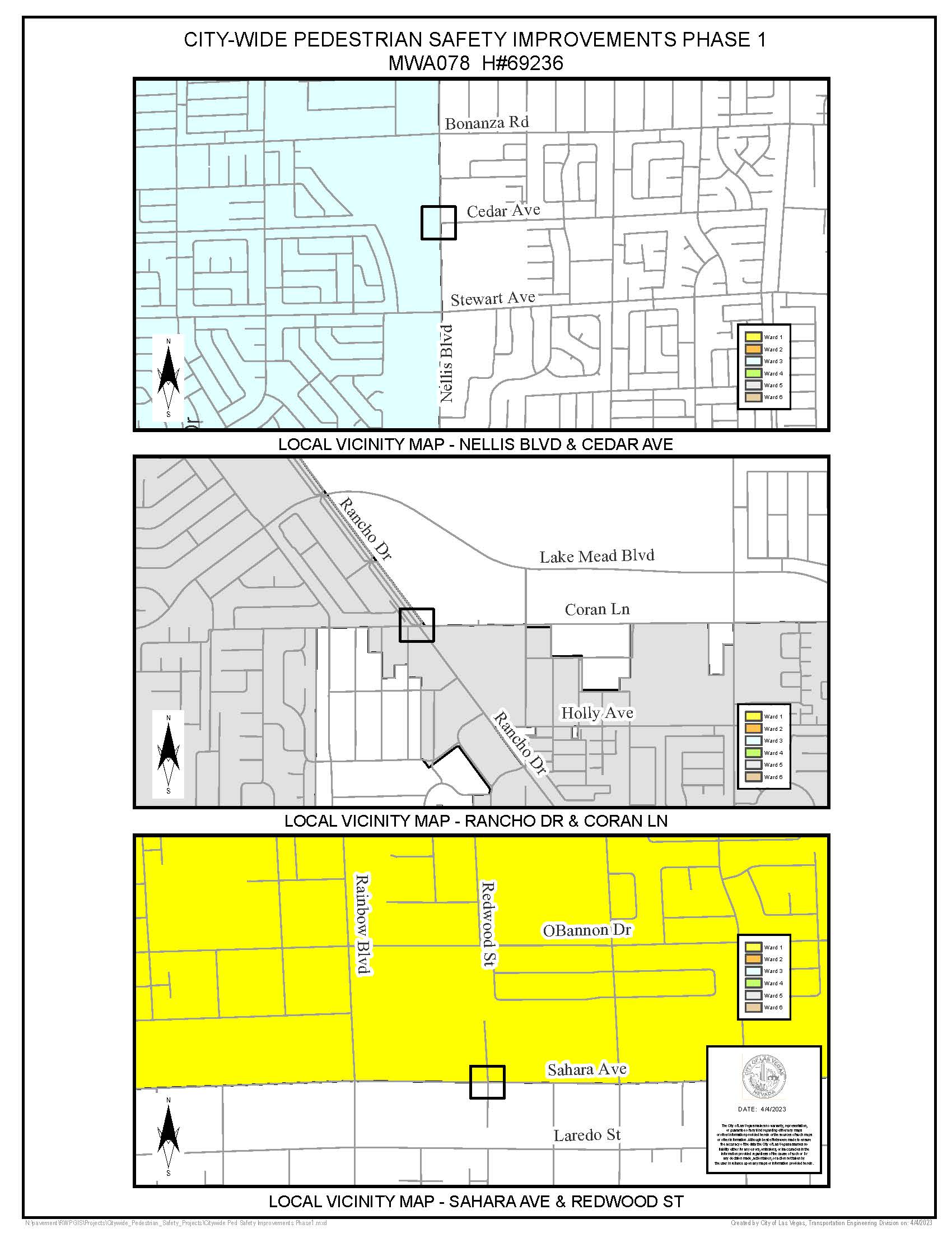 The city of Las Vegas is beginning pedestrian safety improvements this summer at three intersections near public schools. Each intersection is on the city’s High Injury Network (HIN), as designated by the Vision Zero Action Plan. The city of Las Vegas HIN consists of the 11% of streets which experience 77% of total serious injury and fatal traffic crashes. Planned improvements at the three intersections — Nellis Boulevard/Cedar Avenue, Rancho Drive/Coran Lane and Sahara Avenue/Redwood Street (see maps) — include upgrading ADA-required ramps, installation of pedestrian flasher systems, construction of median crossing refuge areas and upgrading street lighting where needed, and added/improved pavement marking and traffic signing. Work is scheduled to be complete in March 2026.