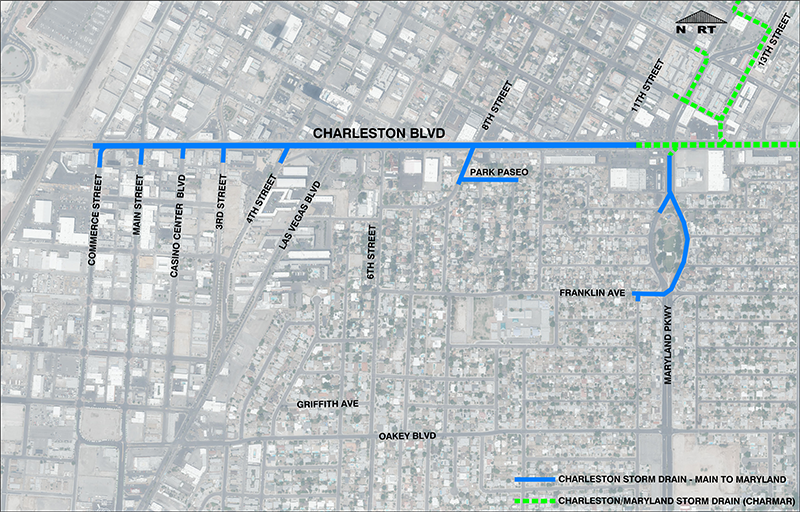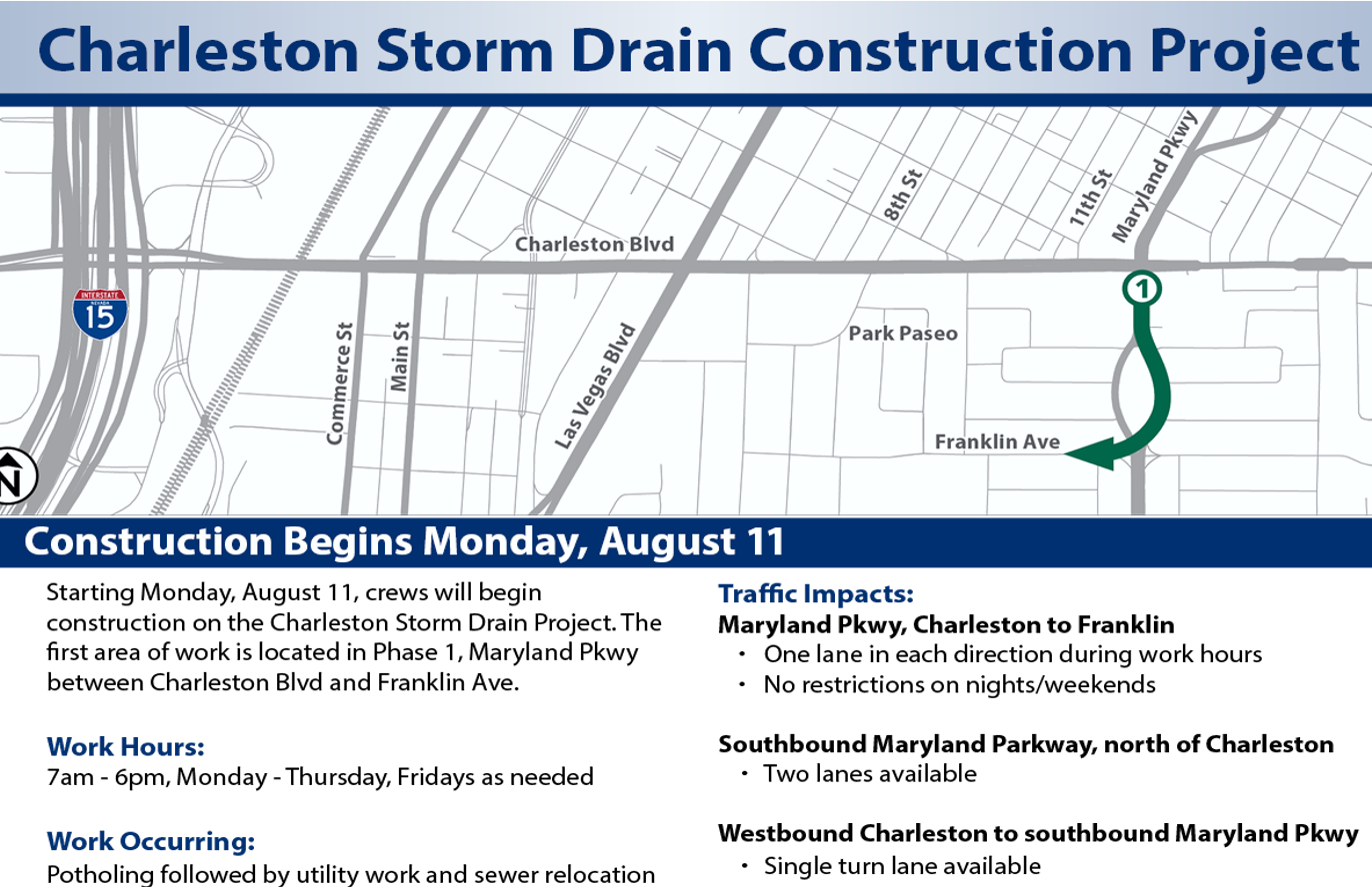 Work will begin Aug. 11, 2025, on Maryland Parkway south of Charleston Boulevard for a flood control project that will install storm drain infrastructure on Maryland Parkway from Charleston to Franklin Avenue and on Charleston Boulevard from Maryland Parkway to Commerce Street during the next two years. Work on phase 1 on Maryland will take approximately six months. See the phase 1 map. Project work on Charleston is expected to begin by the first week of September 2025.