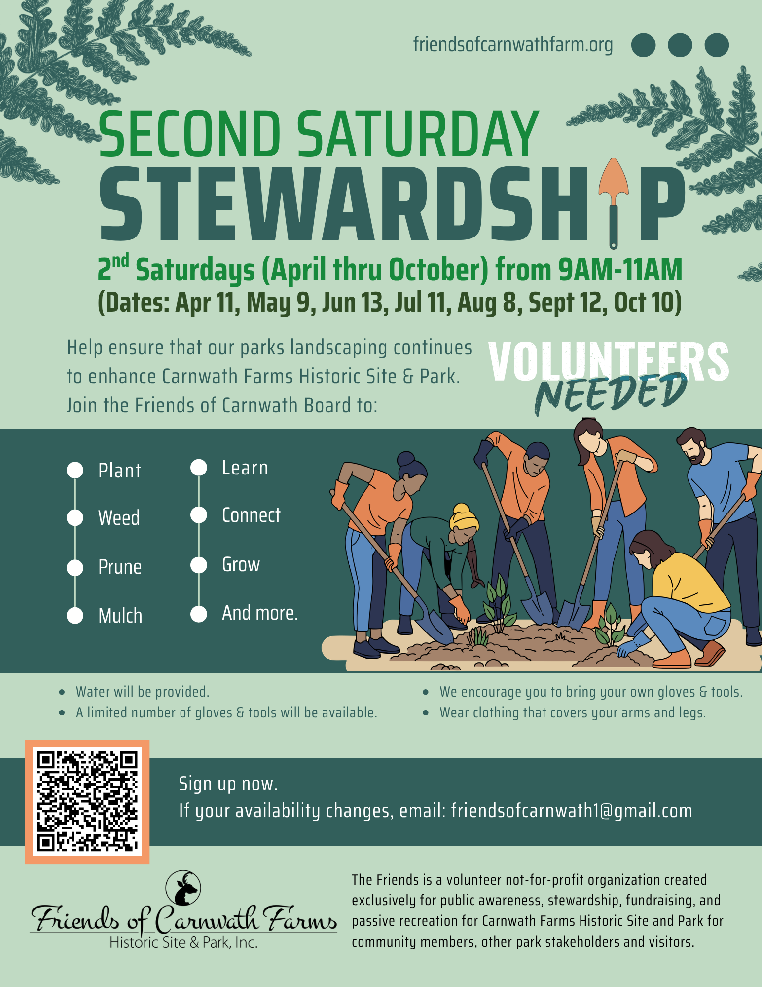 Volunteers needed to plant, weed, prune, mulch while learing, connecting, growing, and enjoying the park. Water will be provided and tools are limited. The Friends of Carnwath organization encourages you to bring your own gloves and tools. Wear clothing that covers your arms and legs to protect your skin.