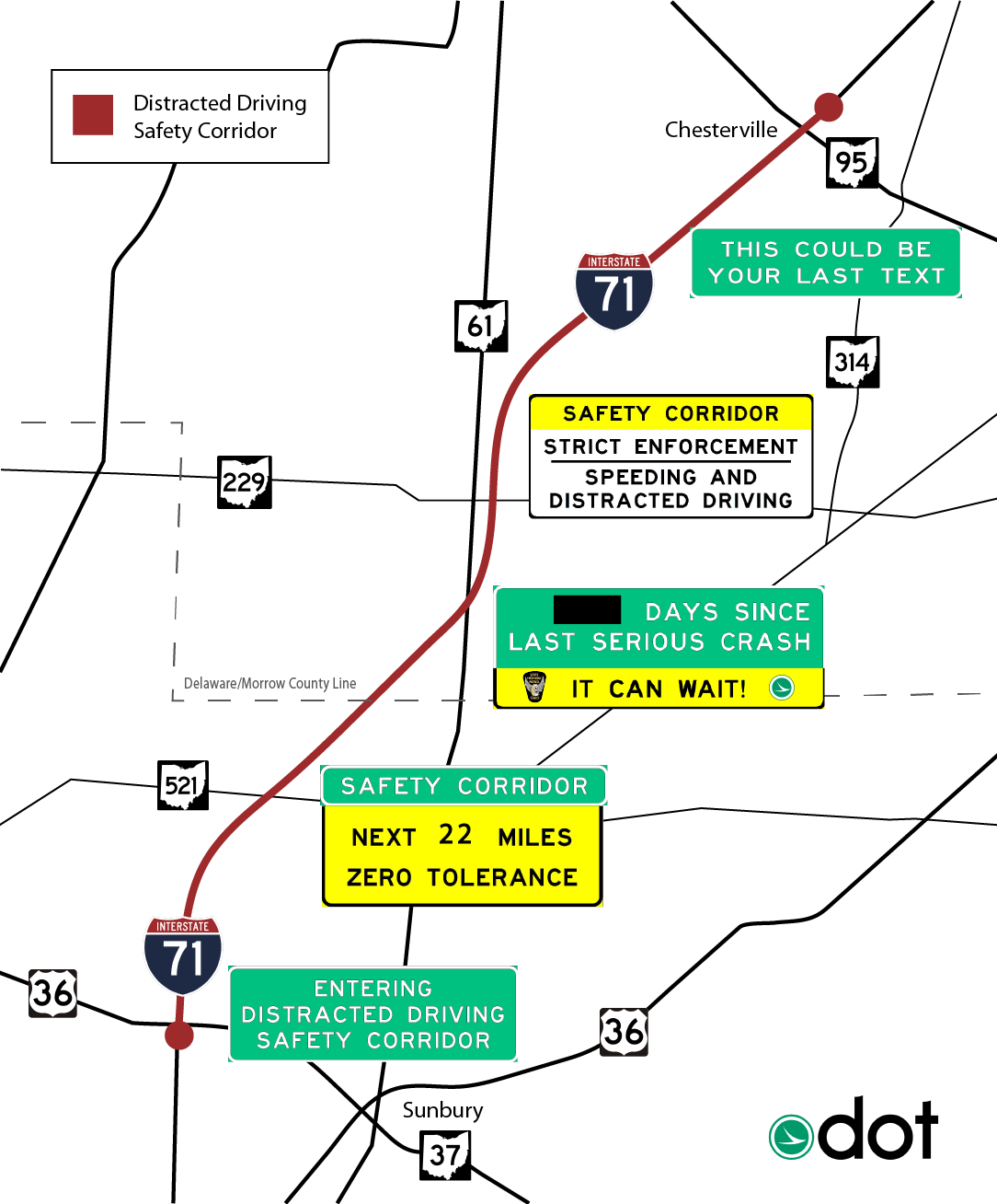 DELAWARE - As more drivers hit the road this summer, the Ohio Department of Transportation (ODOT) and the Ohio State Highway Patrol (OSHP) have teamed up to designate the first distracted driving safety corridor in Central Ohio. A 22-mile stretch of Interstate 71 spanning Delaware and Morrow Counties is the newest location for targeted enforcement and more than a dozen signs to remind motorists to ditch the distractions.