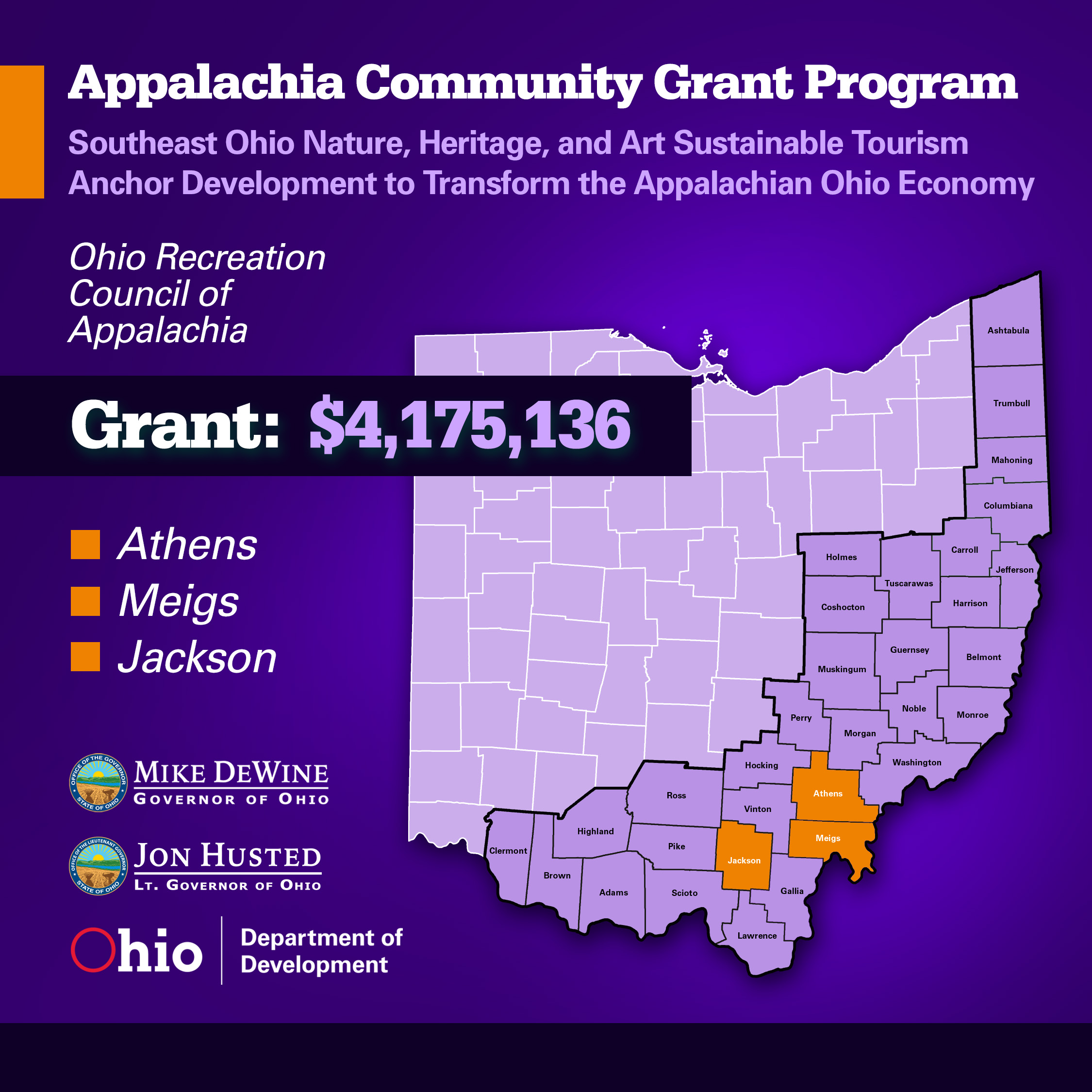A total of $50 million in development grants will be awarded in the program's first round to launch four transformational projects impacting communities in Athens, Carroll, Columbiana, Coshocton, Gallia, Hocking, Jackson, Jefferson, Mahoning, Meigs, and Perry counties.