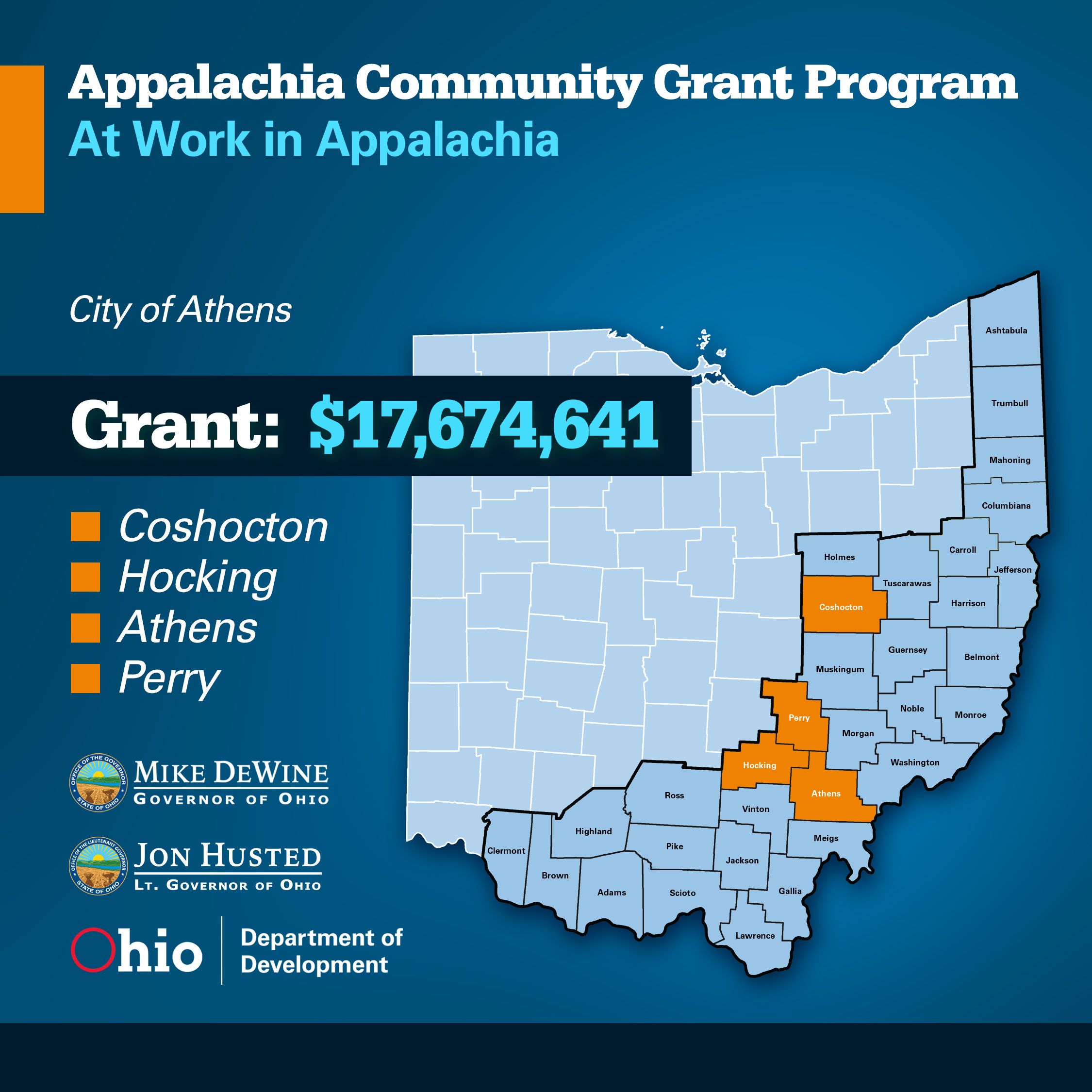 The City of Athens will receive an Appalachian Community Grant of up to $17,674,641 to revitalize 80,000 square feet of downtown space with the rehabilitation of six historic buildings in Coshocton, Logan, Somerset, and Athens. The buildings include the Athens Armory, Coshocton Collaborative, Somerset Builders Club, Logan Theater and Community Arts Center, Hocking Hills Children’s Museum, and Hocking Hills Chamber.